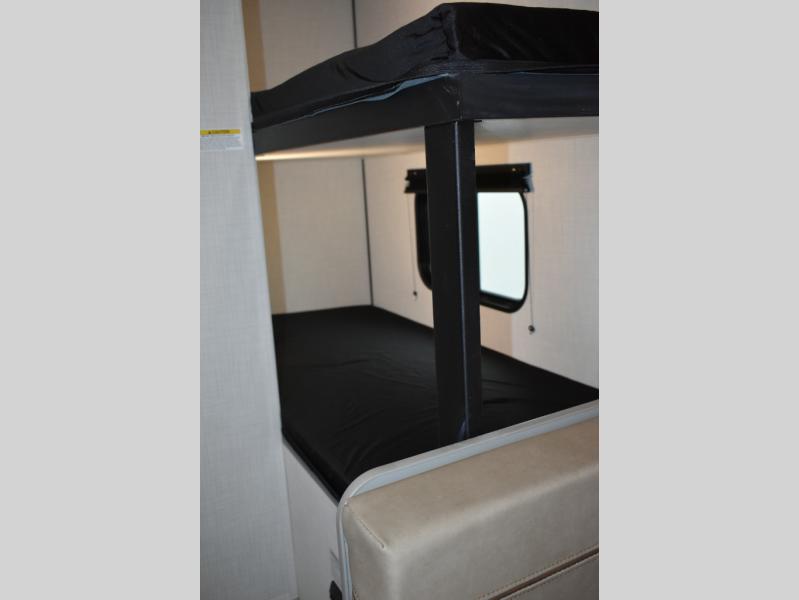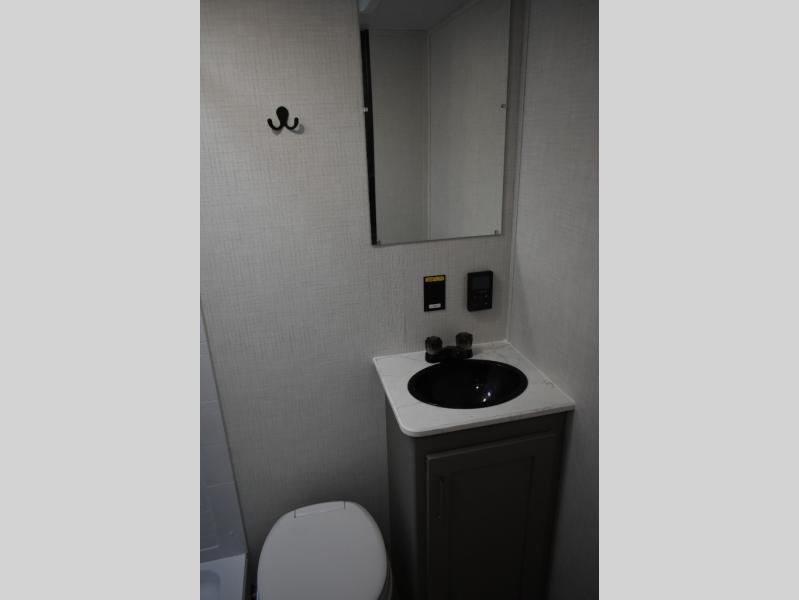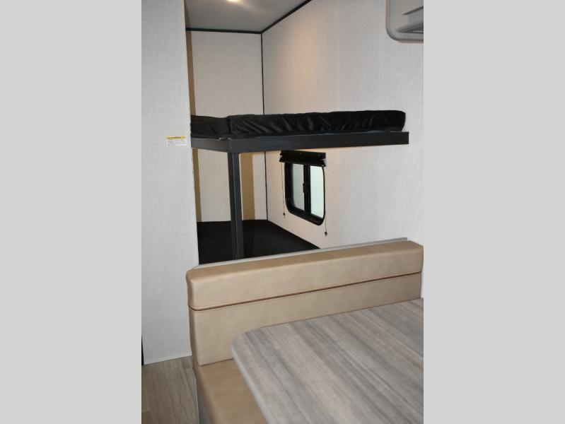 This trailer will fit perfectly for a group of five or less thanks to all the sleeping space! The owners will have a queen-size bed, and others can choose between the rear corner bunk beds or the booth dinette once set up for bedtime. There is a full bathroom for convenience when changing and getting cleaned up, a galley kitchen with a two burner cooktop plus a 3.3 cu. ft. refrigerator for the cold items. And you can stow your larger camping items in the exterior pass-through compartment.
