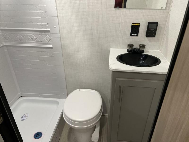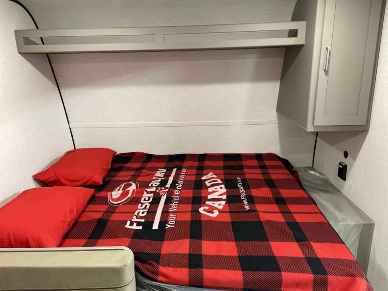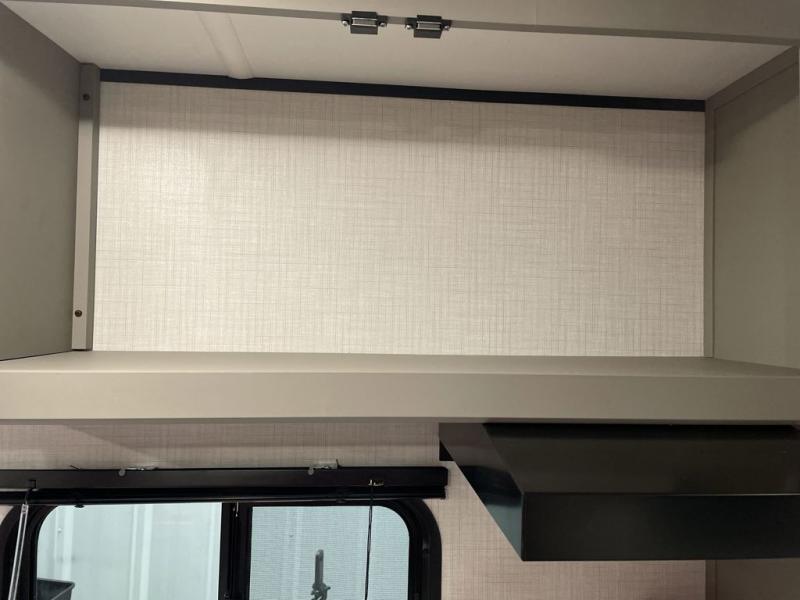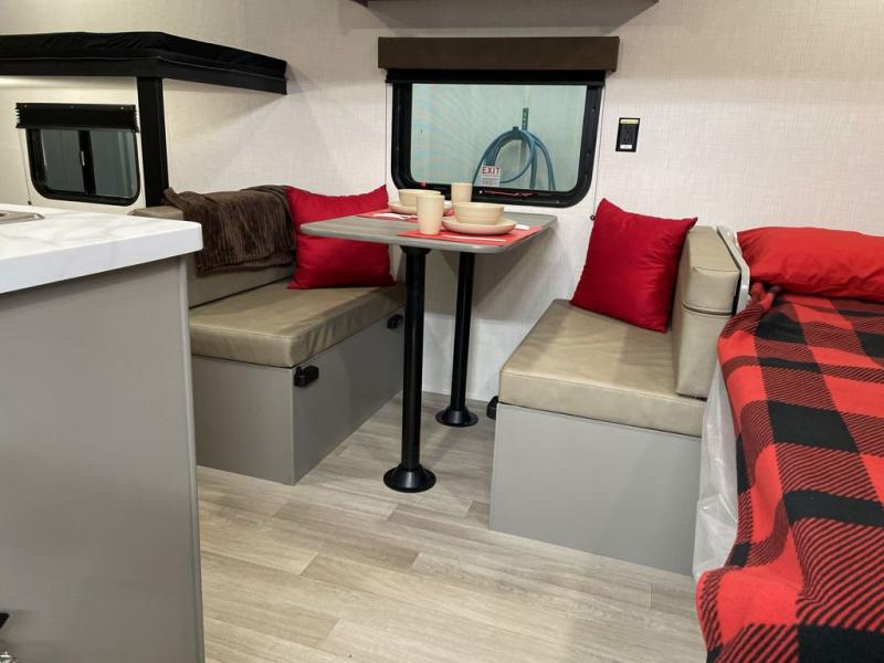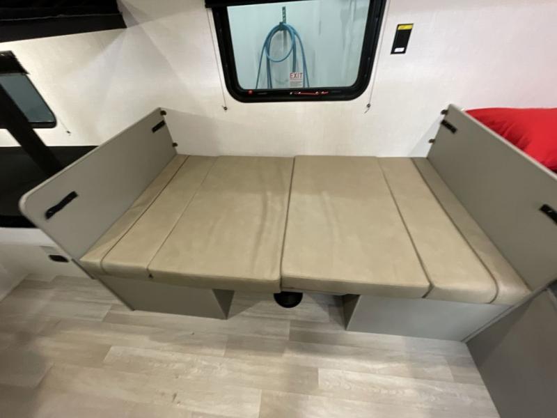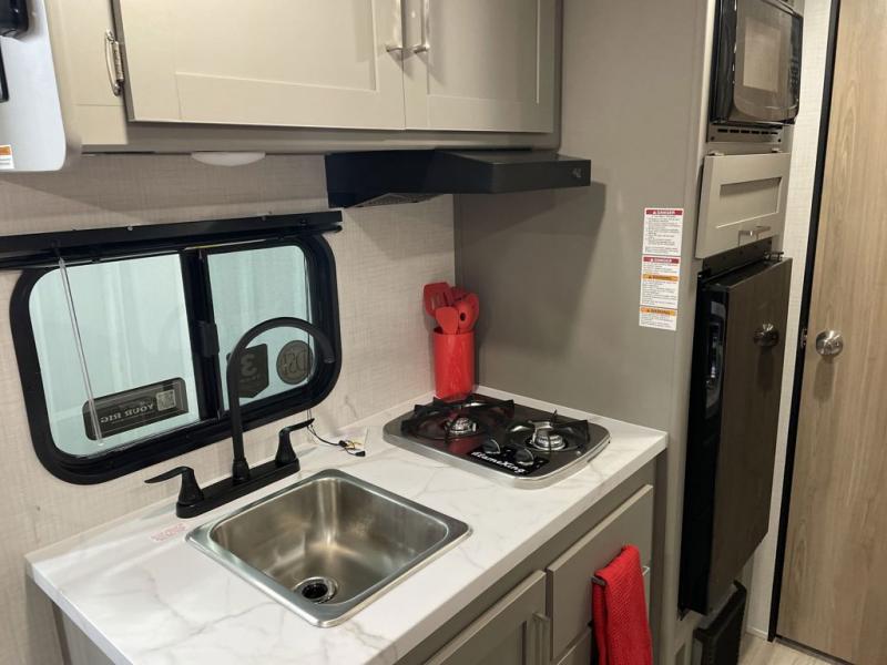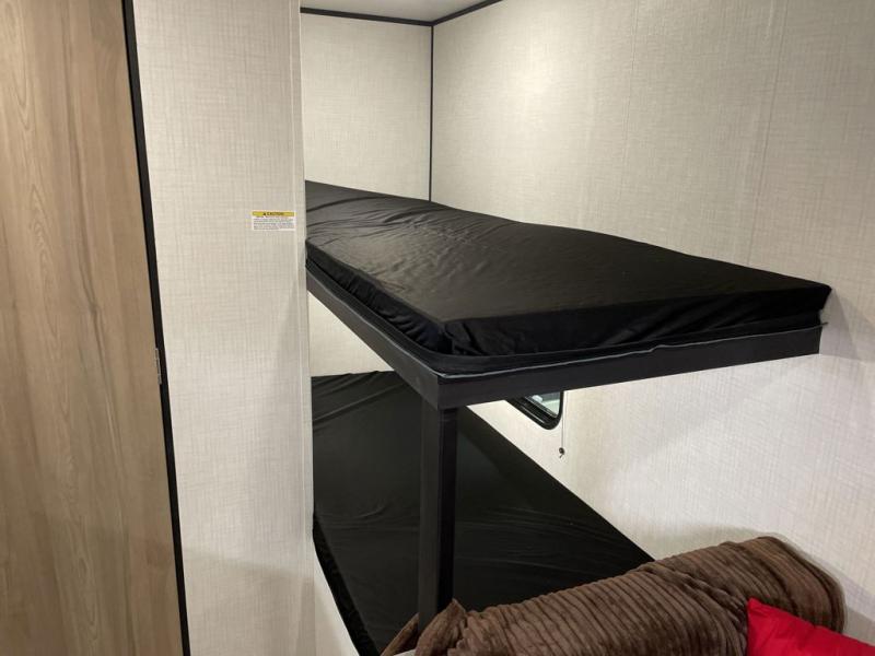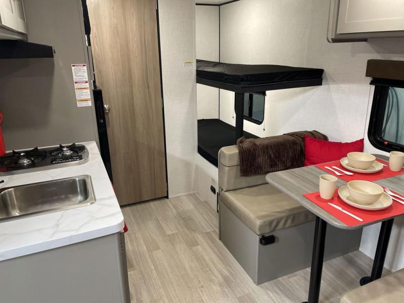 This travel trailer with rear corner bunk beds is sure to be a hit at the campground! While your guests or little ones take the bunks, you can enjoy the front Olympic RV queen bed to yourselves. There is even storage under the bed, an overhead shelf, and a wardrobe for your things. The chef of your group can whip up meals on the two-burner cooktop or in the microwave oven, and there is a 3.3 cu. ft. 12V refrigerator to keep food fresh. A booth dinette provides a place to dine together, or you can take your plate outdoors to sit under the 8' power awning with LED lights!