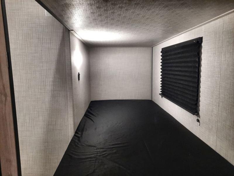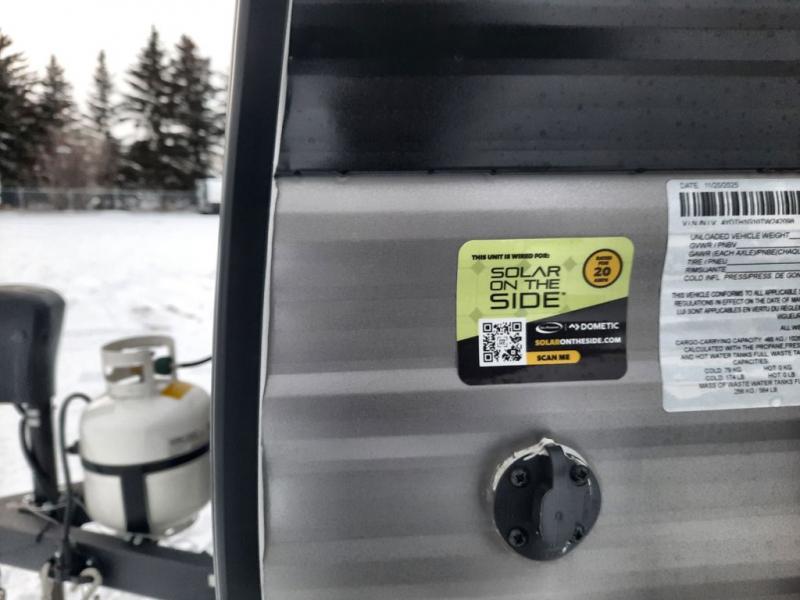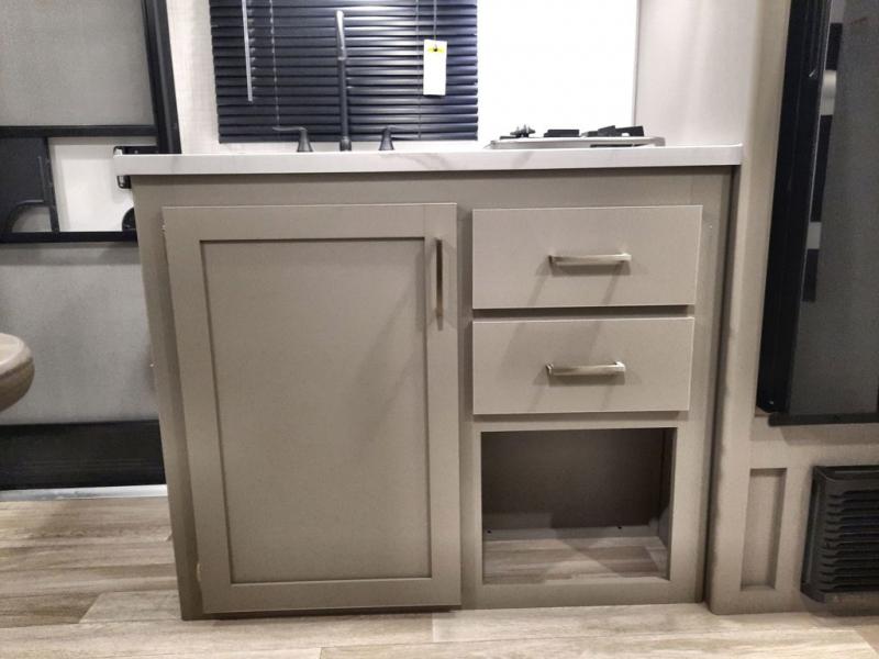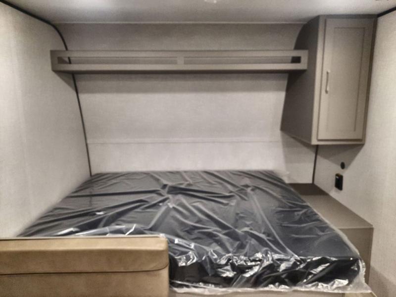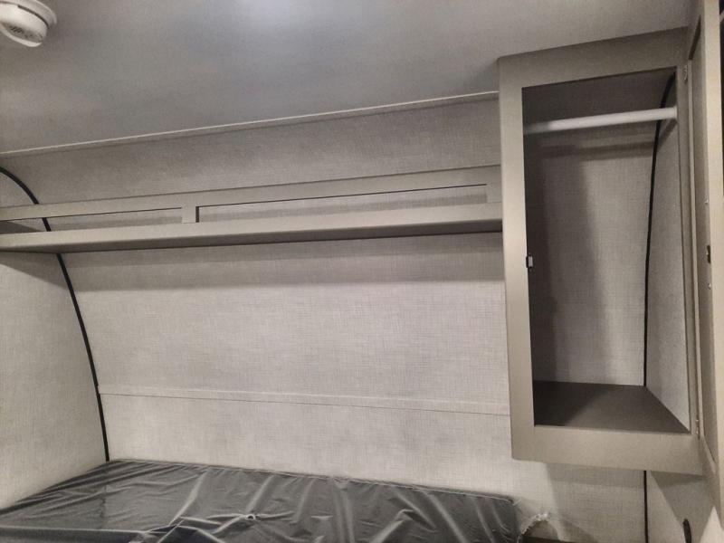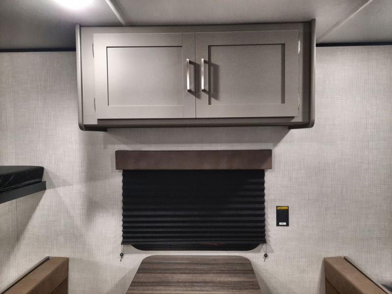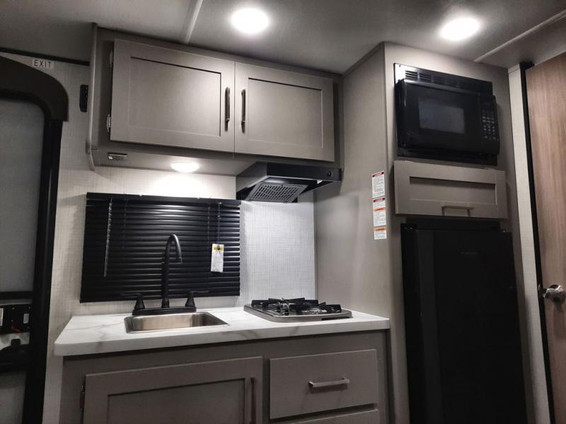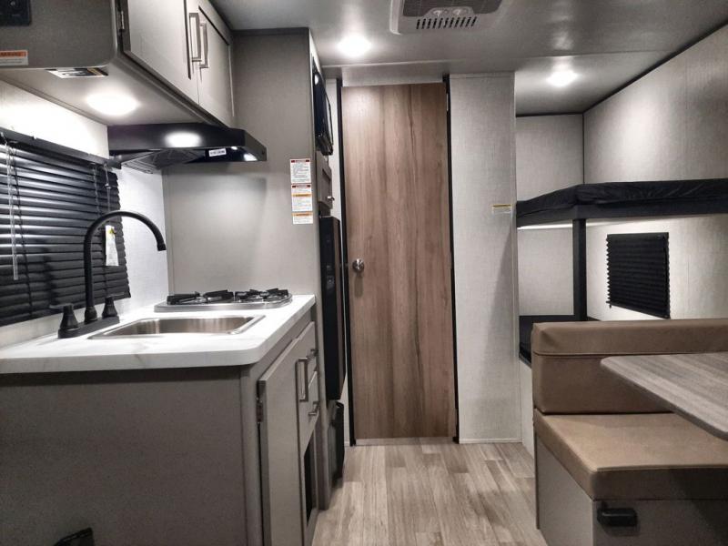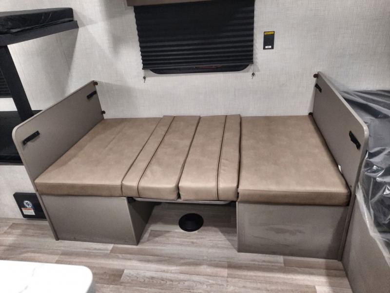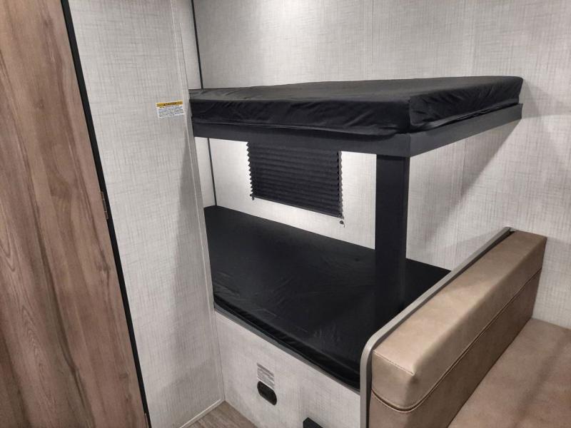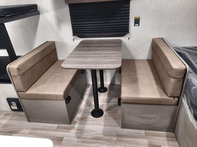 This travel trailer with rear corner bunk beds is sure to be a hit at the campground! While your guests or little ones take the bunks, you can enjoy the front Olympic RV queen bed to yourselves. There is even storage under the bed, an overhead shelf, and a wardrobe for your things. The chef of your group can whip up meals on the two-burner cooktop or in the microwave oven, and there is a 3.3 cu. ft. 12V refrigerator to keep food fresh. A booth dinette provides a place to dine together, or you can take your plate outdoors to sit under the 8' power awning with LED lights!