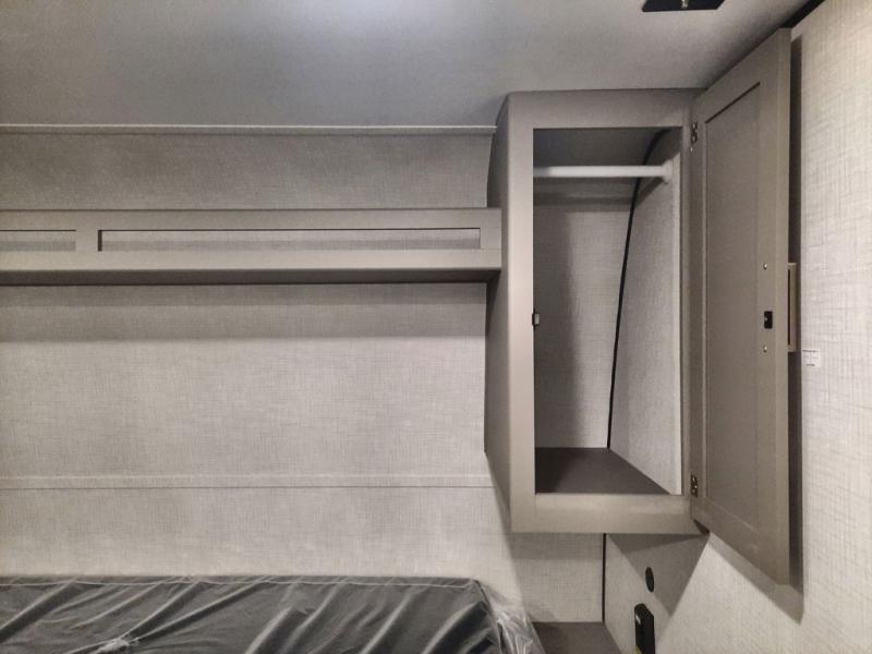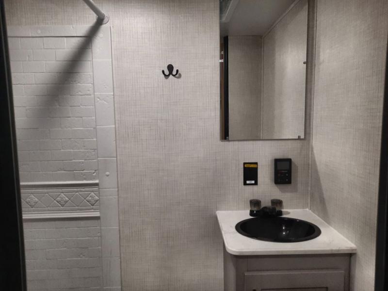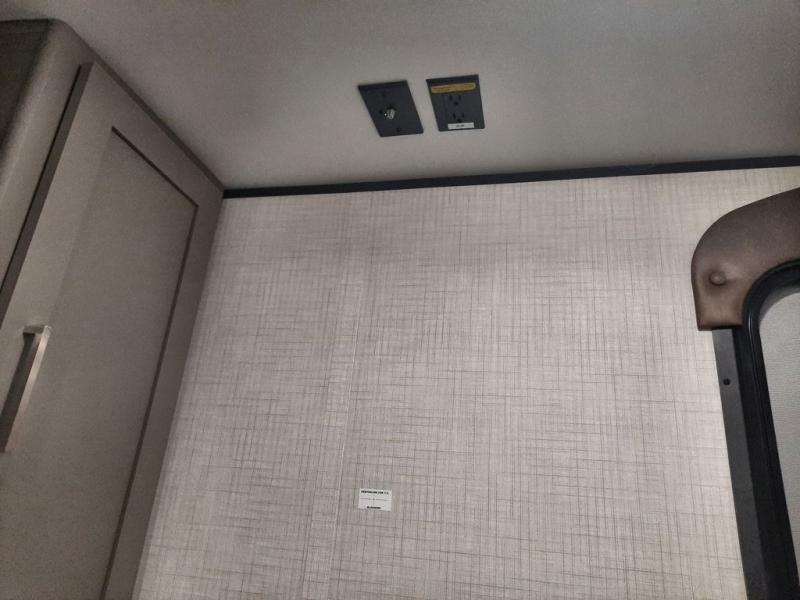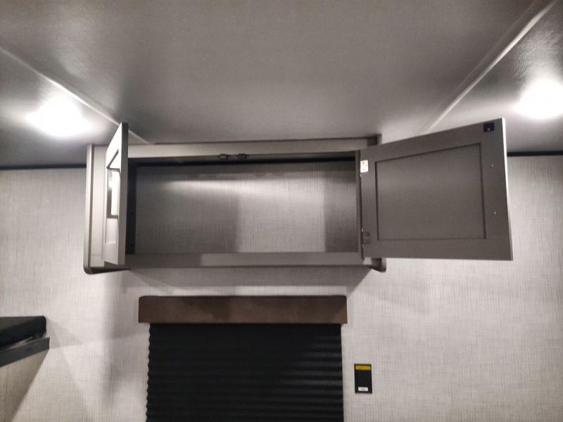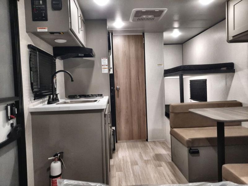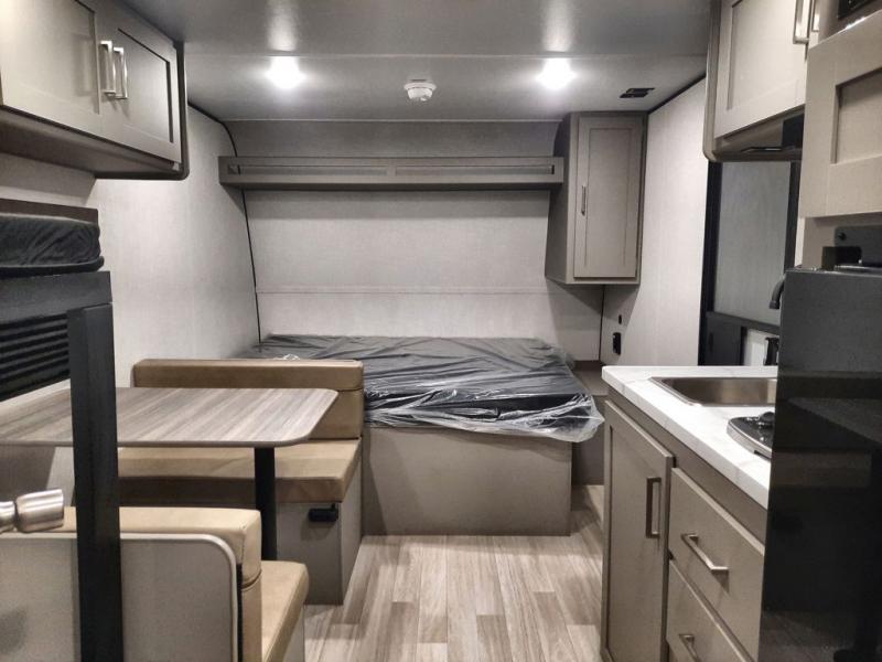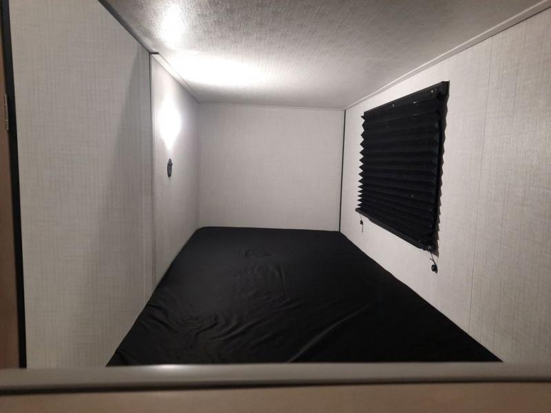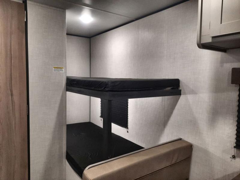This travel trailer with rear corner bunk beds is sure to be a hit at the campground! While your guests or little ones take the bunks, you can enjoy the front Olympic RV queen bed to yourselves. There is even storage under the bed, an overhead shelf, and a wardrobe for your things. The chef of your group can whip up meals on the two-burner cooktop or in the microwave oven, and there is a 3.3 cu. ft. 12V refrigerator to keep food fresh. A booth dinette provides a place to dine together, or you can take your plate outdoors to sit under the 8' power awning with LED lights!