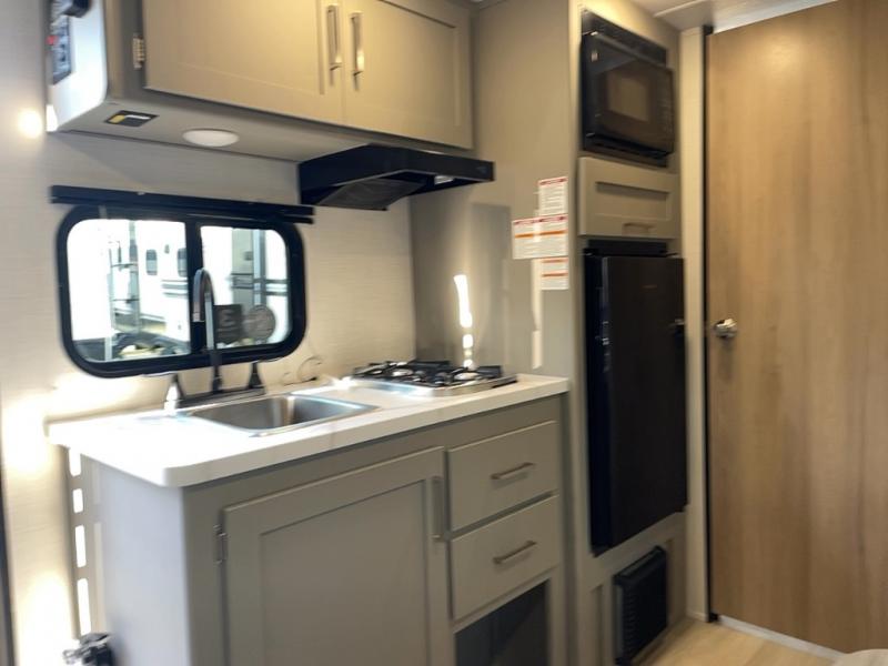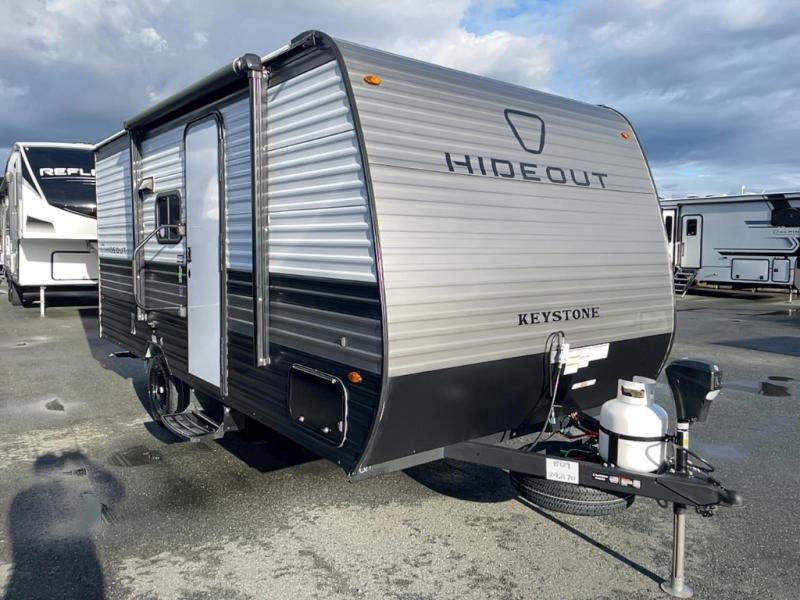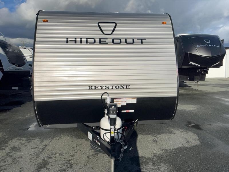 With any Hideout Mini travel trailer by Keystone, you will enjoy lightweight towing thanks to their single axle! The XL tinted safety glass windows are ultra durable, and the power awning will provide protection from the sun as you relax in your camp chairs outside. Each model includes blackout night shades, LED lighting, plus many more interior comforts. There is also a 20K BTU furnace to keep you comfortable, plus a tankless water heater for endless hot showers!