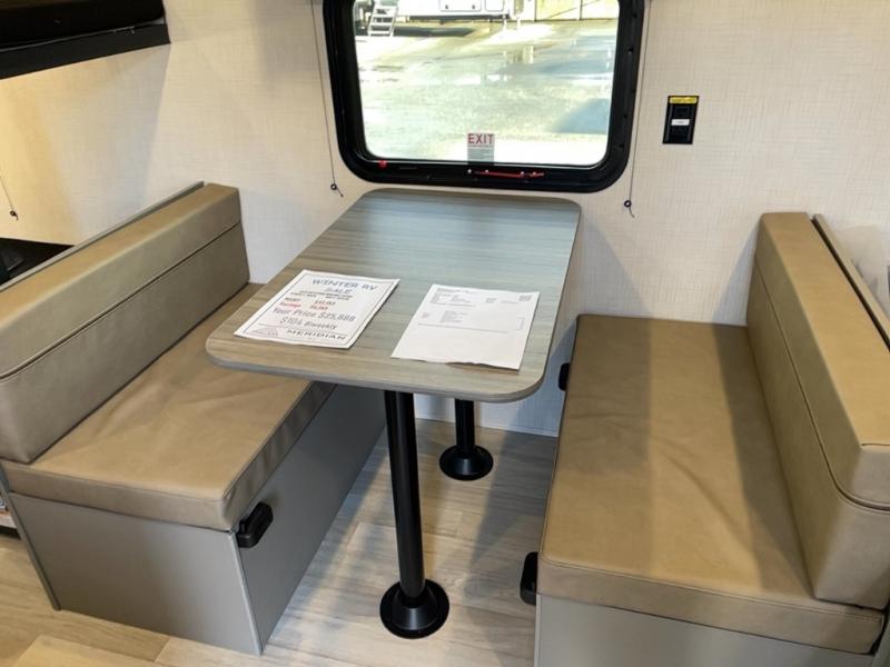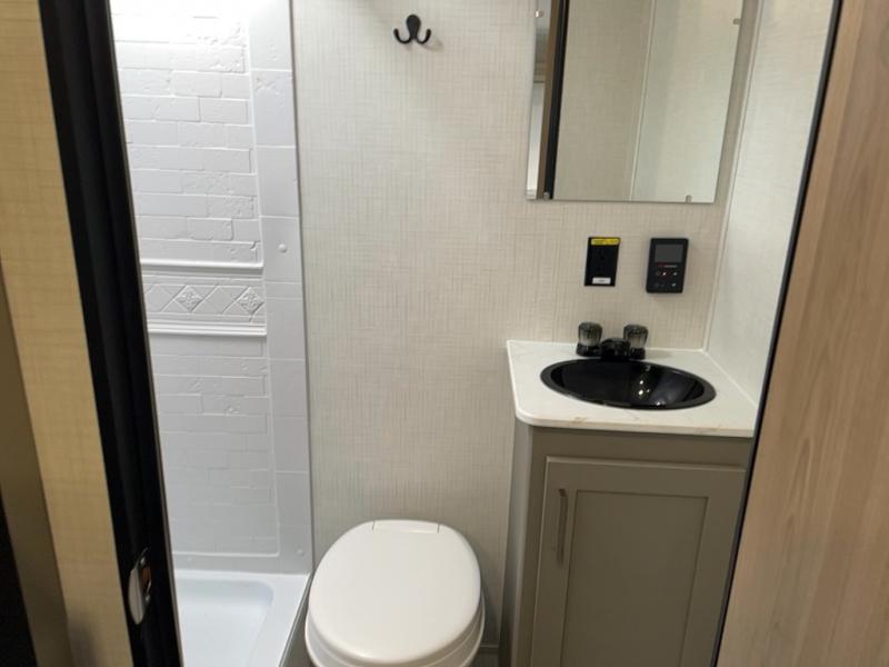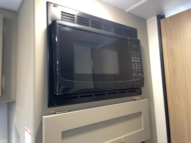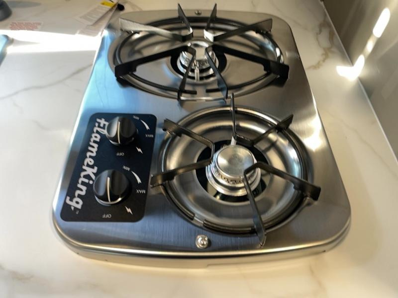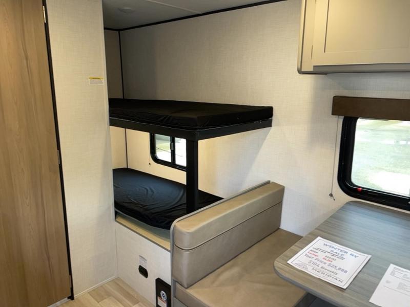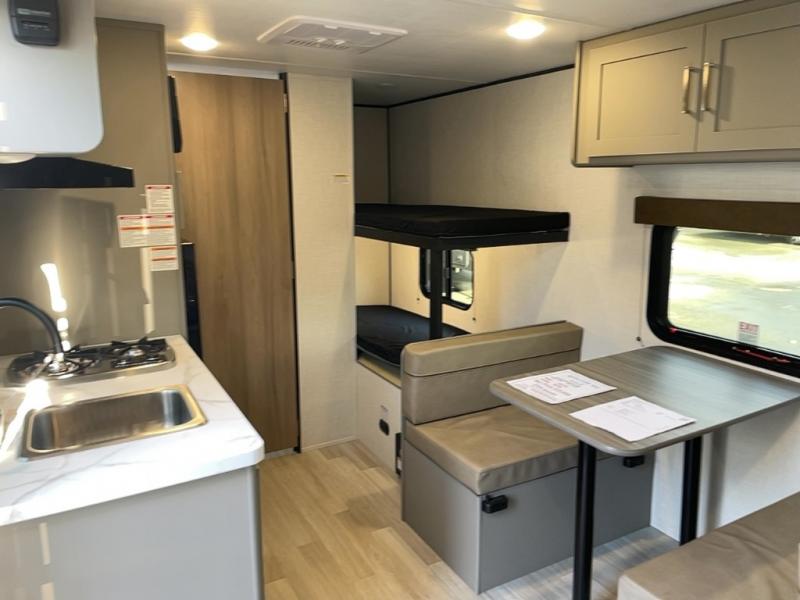 This travel trailer with rear corner bunk beds is sure to be a hit at the campground! While your guests or little ones take the bunks, you can enjoy the front Olympic RV queen bed to yourselves. There is even storage under the bed, an overhead shelf, and a wardrobe for your things. The chef of your group can whip up meals on the two-burner cooktop or in the microwave oven, and there is a 3.3 cu. ft. 12V refrigerator to keep food fresh. A booth dinette provides a place to dine together, or you can take your plate outdoors to sit under the 8' power awning with LED lights!