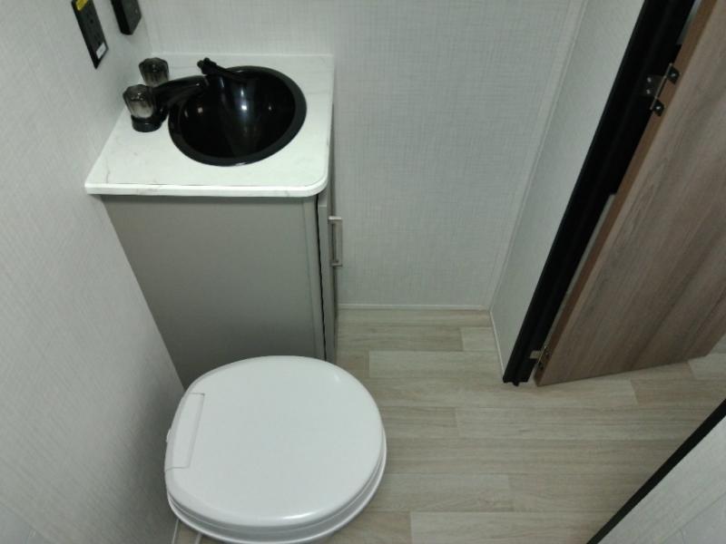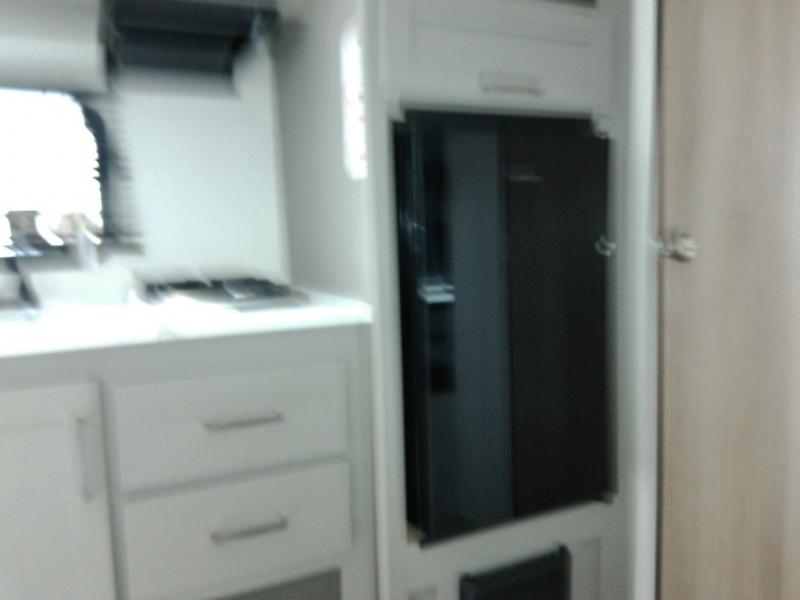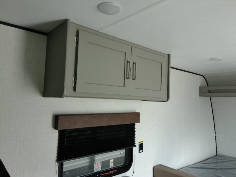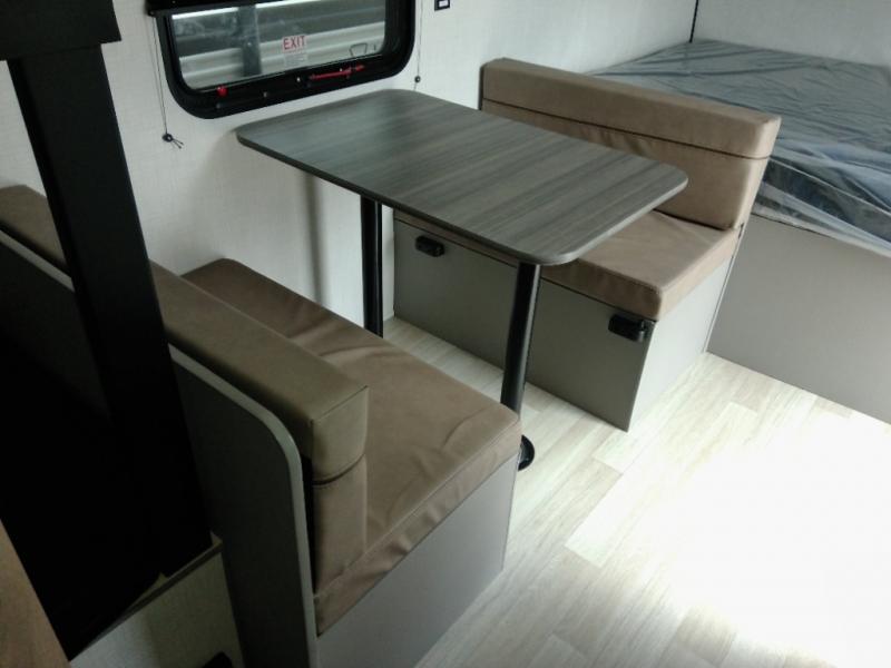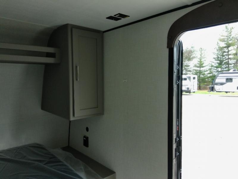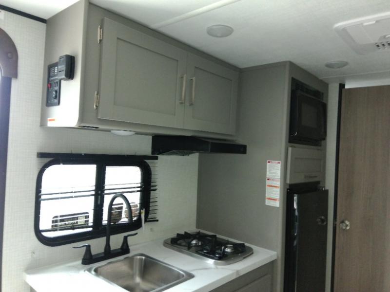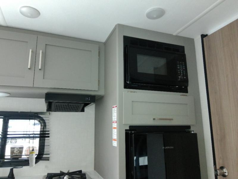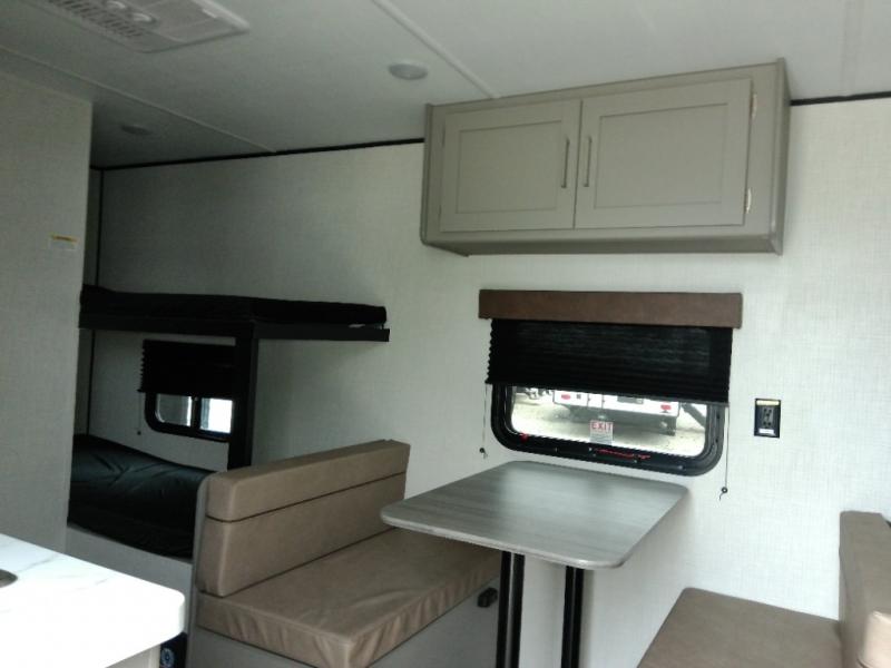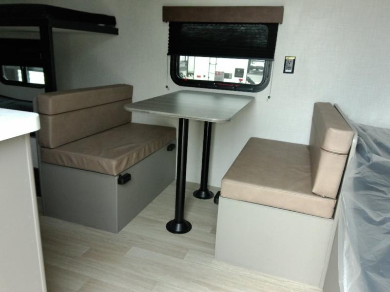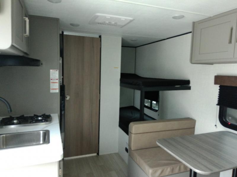 This travel trailer with rear corner bunk beds is sure to be a hit at the campground! While your guests or little ones take the bunks, you can enjoy the front Olympic RV queen bed to yourselves. There is even storage under the bed, an overhead shelf, and a wardrobe for your things. The chef of your group can whip up meals on the two-burner cooktop or in the microwave oven, and there is a 3.3 cu. ft. 12V refrigerator to keep food fresh. A booth dinette provides a place to dine together, or you can take your plate outdoors to sit under the 8' power awning with LED lights!