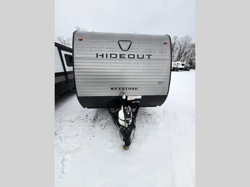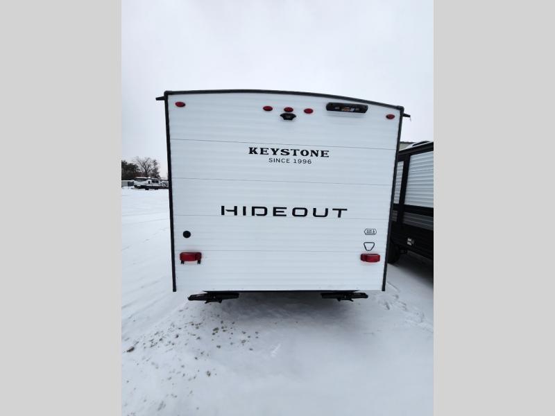 With any Hideout Mini travel trailer by Keystone, you will enjoy lightweight towing thanks to their single axle! The XL tinted safety glass windows are ultra durable, and the power awning will provide protection from the sun as you relax in your camp chairs outside. Each model includes blackout night shades, LED lighting, plus many more interior comforts. There is also a 20K BTU furnace to keep you comfortable, plus a tankless water heater for endless hot showers!