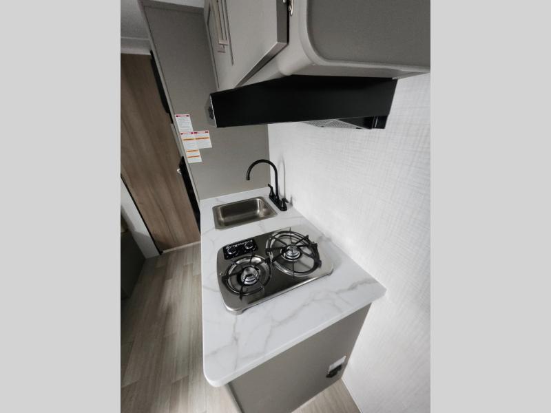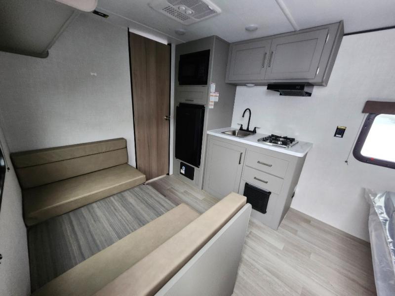 Camping trips just got easier travel trailer that can sleep three to four each night! There is a front Olympic RV queen bed with an overhead shelf and bedside wardrobe for your things. A two-burner cooktop and microwave oven will let you make breakfast for your crew, and a booth dinette provides a place to dine together, as well as convert to sleeping space for a guest or two little ones. This travel trailer also includes a full rear bath, complete with a shower, toilet, and vanity with a sink and overhead cabinet!