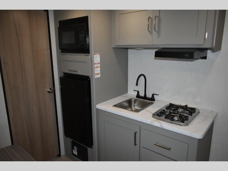 With any Hideout Mini travel trailer by Keystone, you will enjoy lightweight towing thanks to their single-axle! The AlphaPly TPO roof membrane is ultra durable, and the power awning will provide protection from the sun as you relax in your camp chairs outside. Each model includes blackout night shades, LED lighting, plus many more interior comforts. There is also a roof A/C and 20K BTU furnace to keep you comfortable, plus a tankless water heater for endless hot showers!