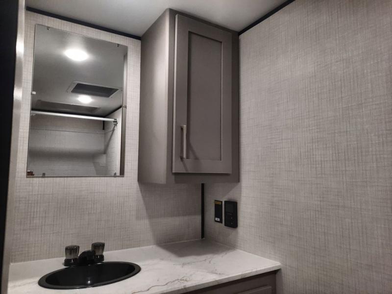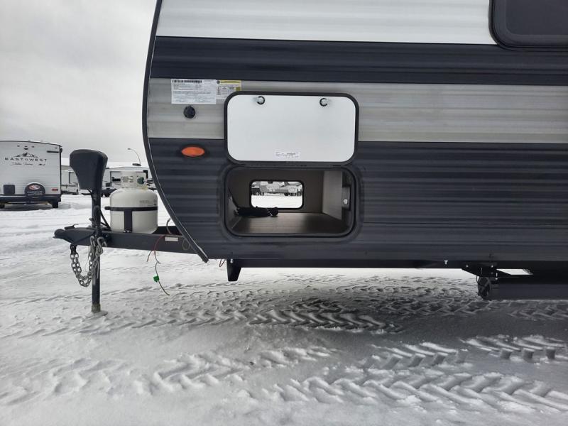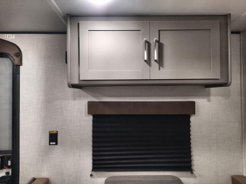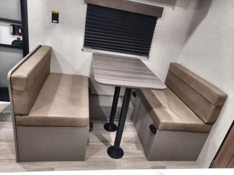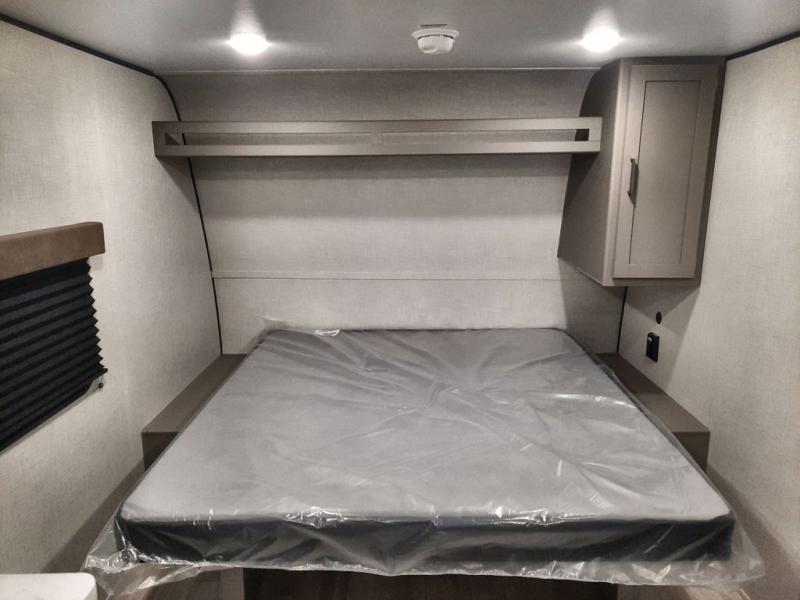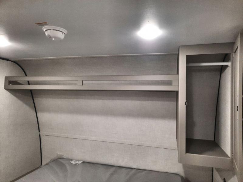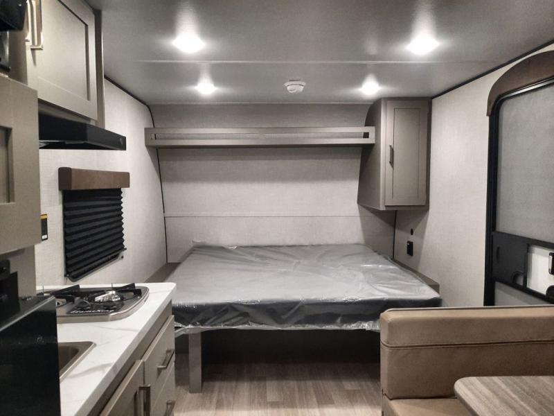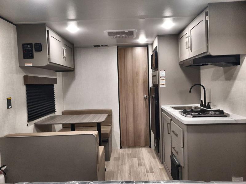 Camping trips just got easier travel trailer that can sleep three to four each night! There is a front Olympic RV queen bed with an overhead shelf and bedside wardrobe for your things. A two-burner cooktop and microwave oven will let you make breakfast for your crew, and a booth dinette provides a place to dine together, as well as convert to sleeping space for a guest or two little ones. This travel trailer also includes a full rear bath, complete with a shower, toilet, and vanity with a sink and overhead cabinet!