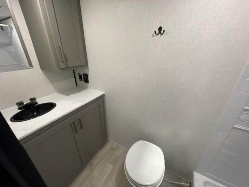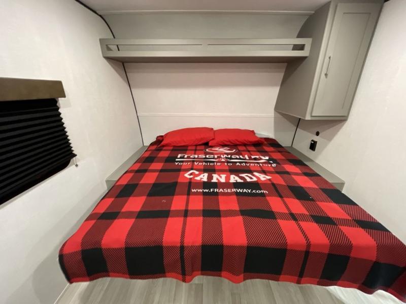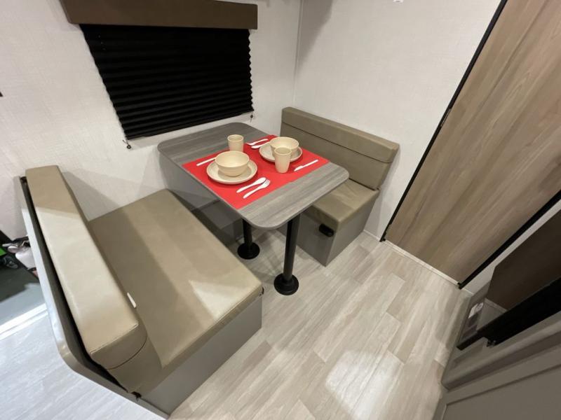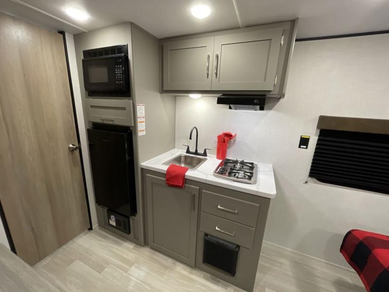 Camping trips just got easier travel trailer that can sleep three to four each night! There is a front Olympic RV queen bed with an overhead shelf and bedside wardrobe for your things. A two-burner cooktop and microwave oven will let you make breakfast for your crew, and a booth dinette provides a place to dine together, as well as convert to sleeping space for a guest or two little ones. This travel trailer also includes a full rear bath, complete with a shower, toilet, and vanity with a sink and overhead cabinet!