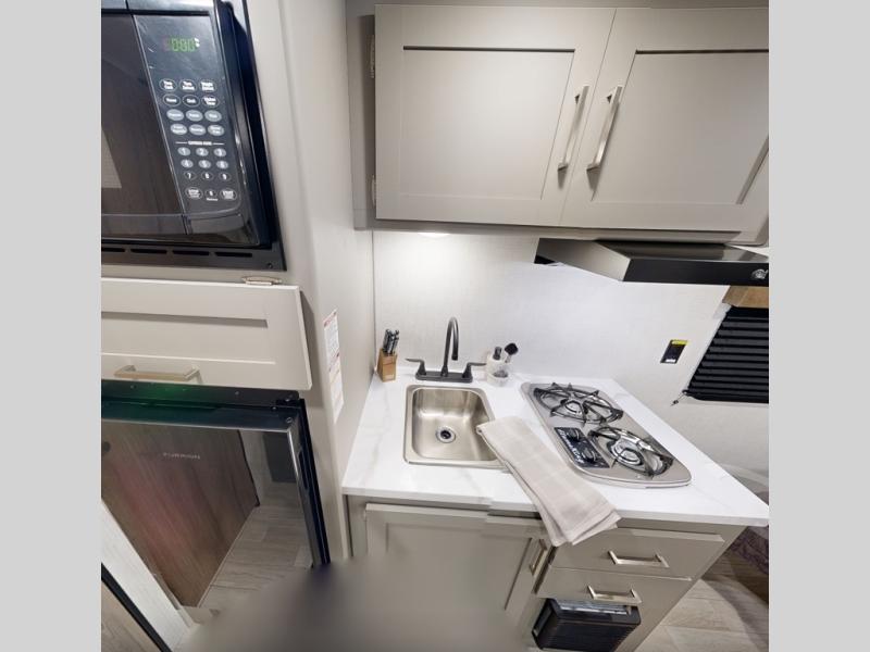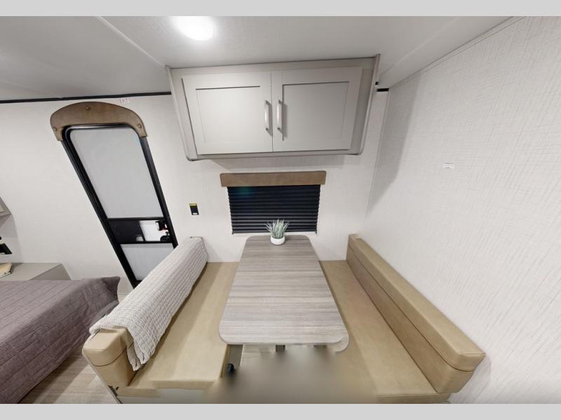 Camping trips just got easier travel trailer that can sleep three to four each night! There is a front Olympic RV queen bed with an overhead shelf and bedside wardrobe for your things. A two-burner cooktop and microwave oven will let you make breakfast for your crew, and a booth dinette provides a place to dine together, as well as convert to sleeping space for a guest or two little ones. This travel trailer also includes a full rear bath, complete with a shower, toilet, and vanity with a sink and overhead cabinet!