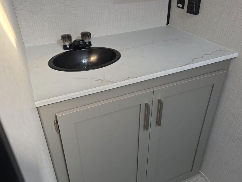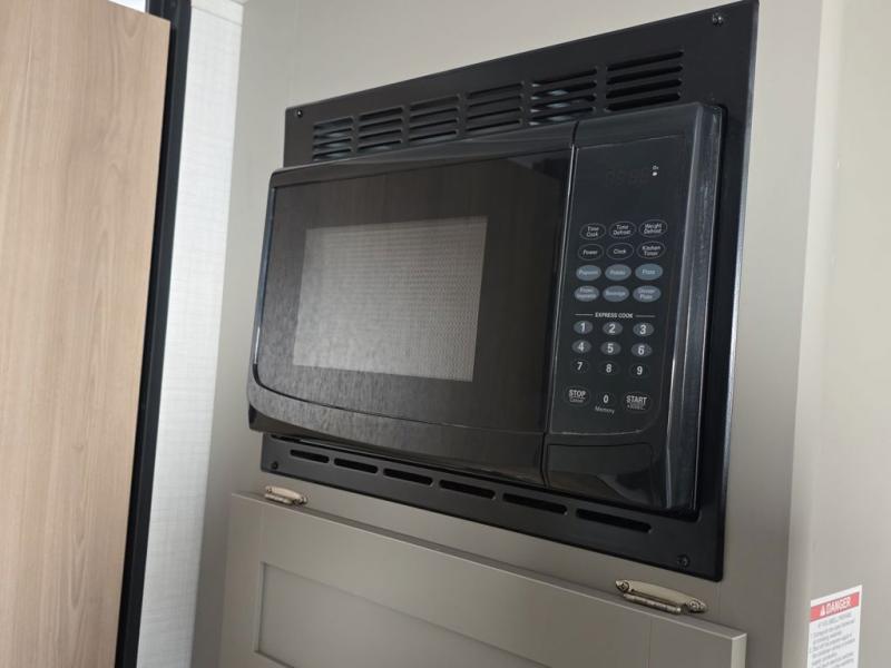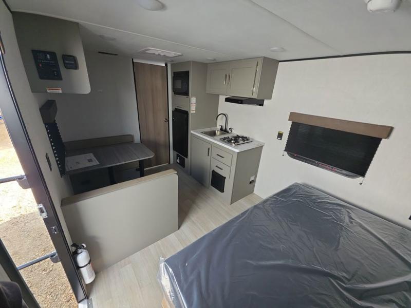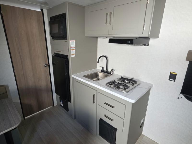 Camping trips just got easier travel trailer that can sleep three to four each night! There is a front Olympic RV queen bed with an overhead shelf and bedside wardrobe for your things. A two-burner cooktop and microwave oven will let you make breakfast for your crew, and a booth dinette provides a place to dine together, as well as convert to sleeping space for a guest or two little ones. This travel trailer also includes a full rear bath, complete with a shower, toilet, and vanity with a sink and overhead cabinet!