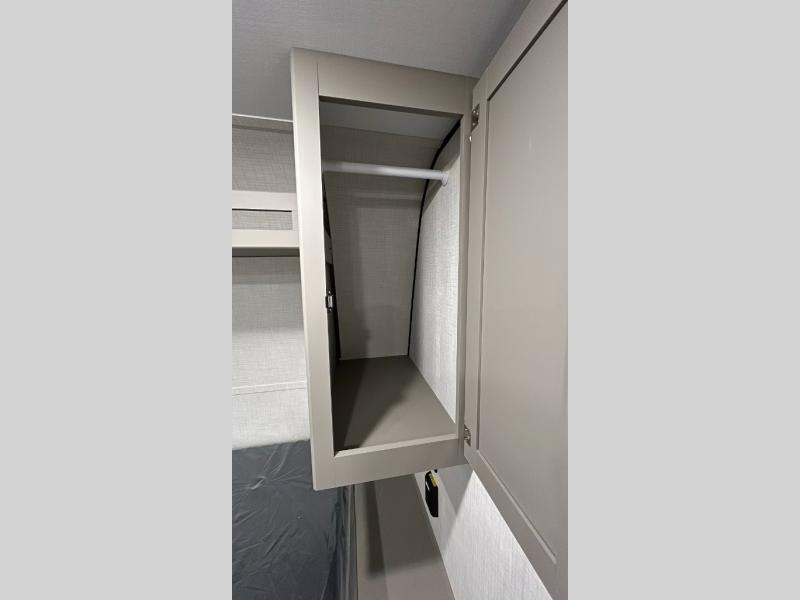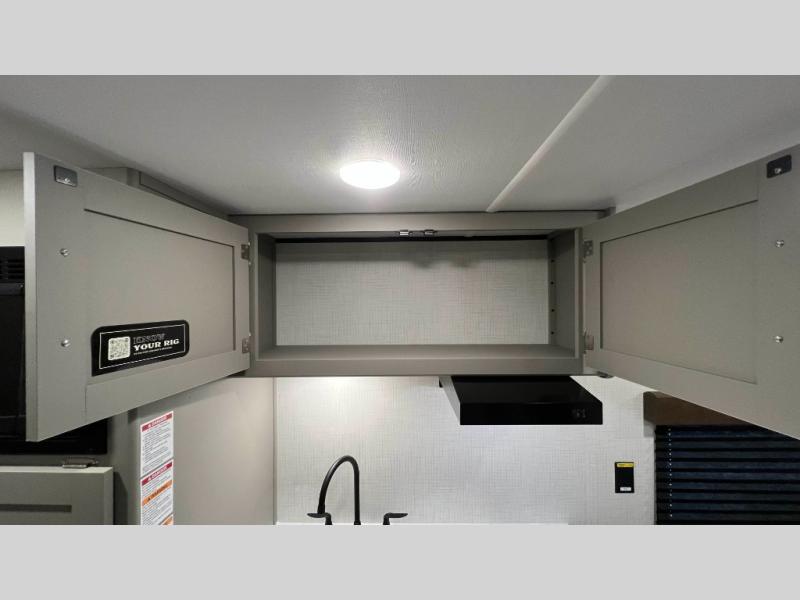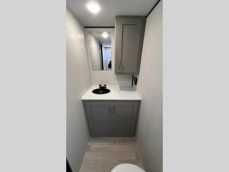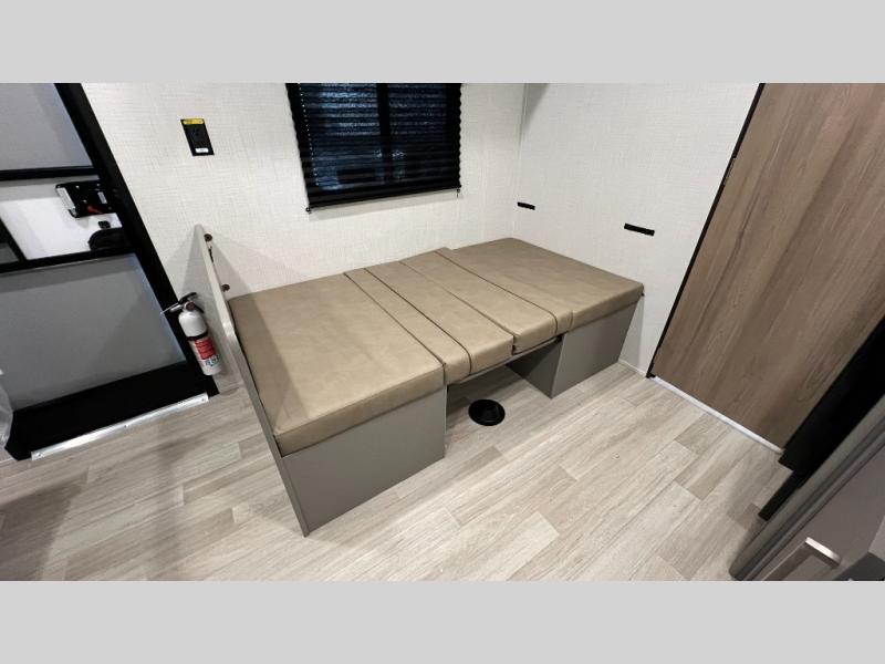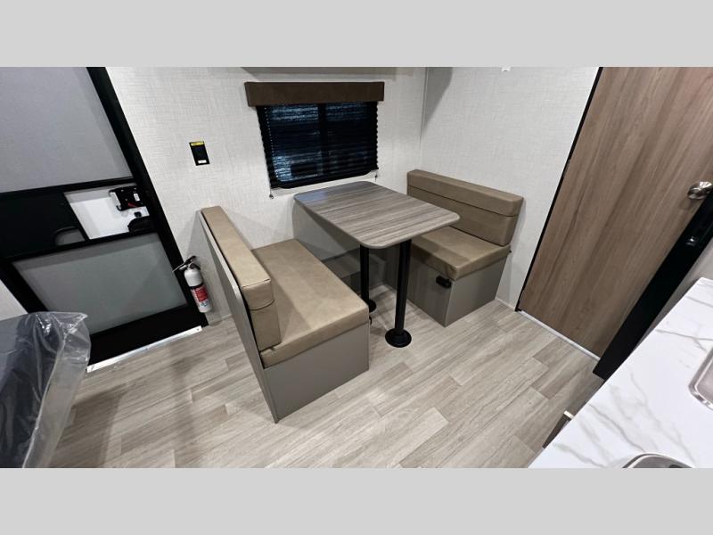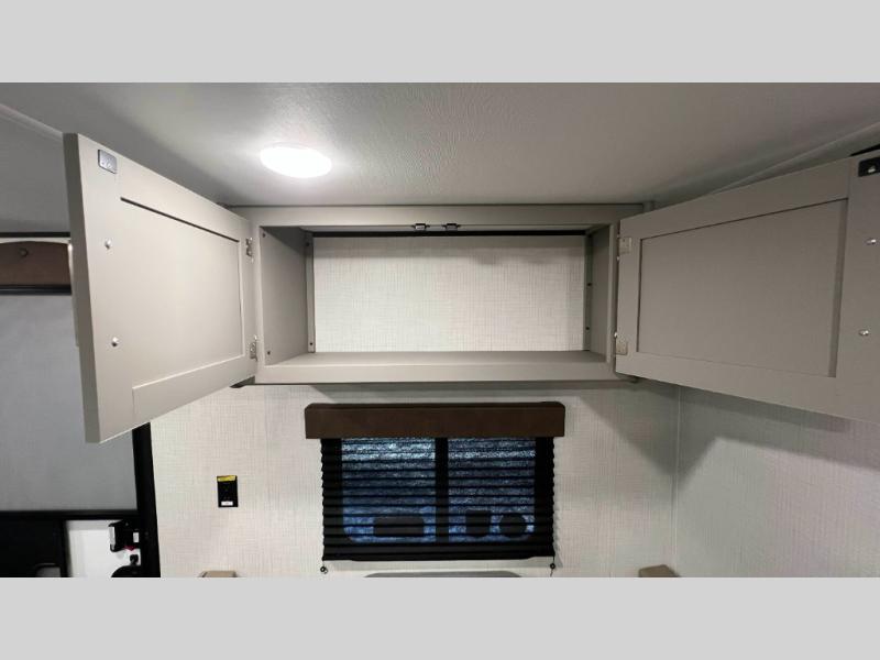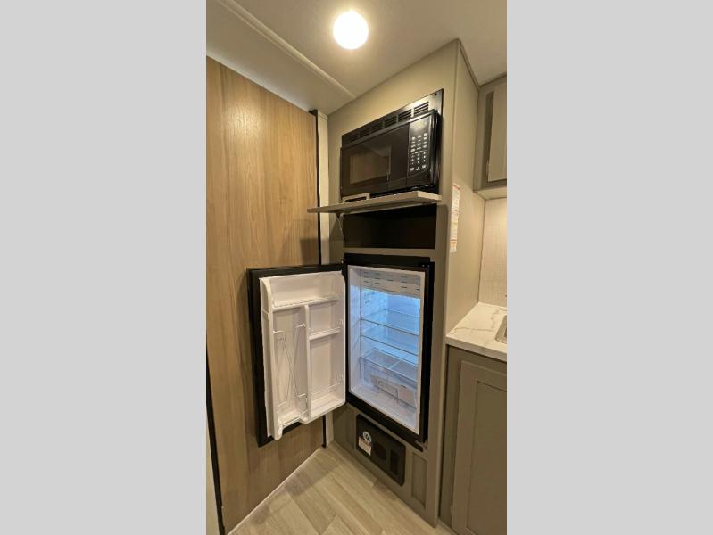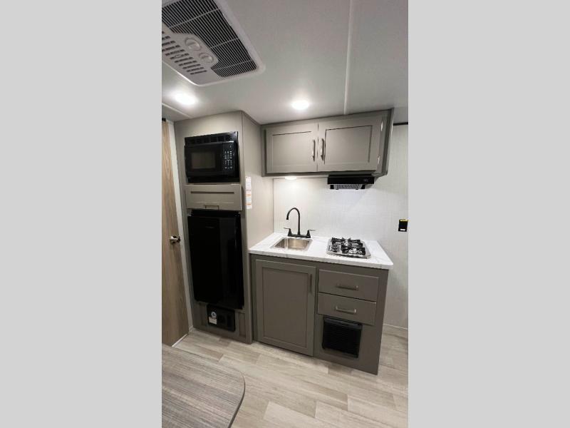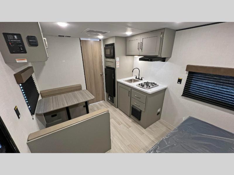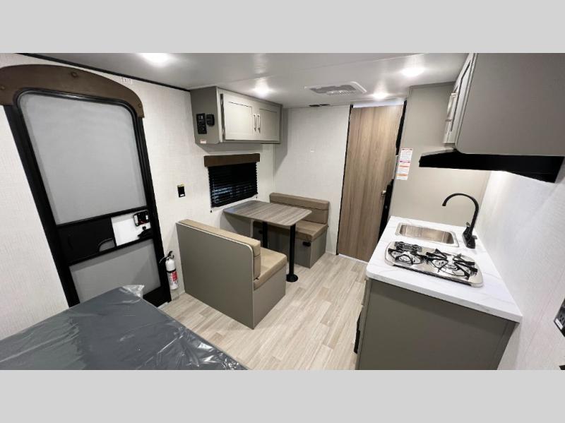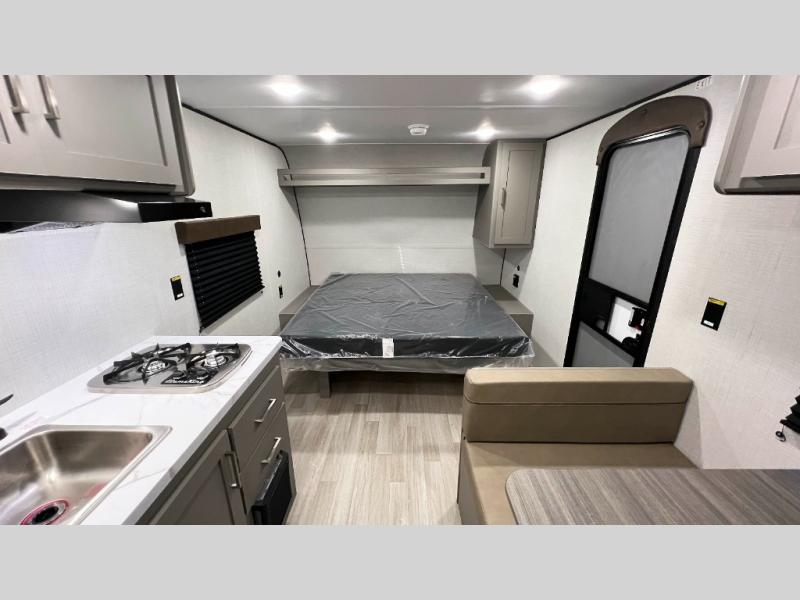 Camping trips just got easier travel trailer that can sleep three to four each night! There is a front Olympic RV queen bed with an overhead shelf and bedside wardrobe for your things. A two-burner cooktop and microwave oven will let you make breakfast for your crew, and a booth dinette provides a place to dine together, as well as convert to sleeping space for a guest or two little ones. This travel trailer also includes a full rear bath, complete with a shower, toilet, and vanity with a sink and overhead cabinet!