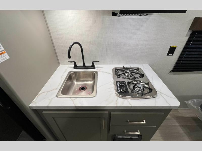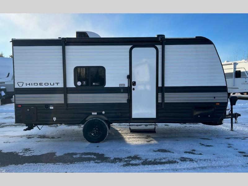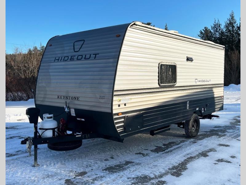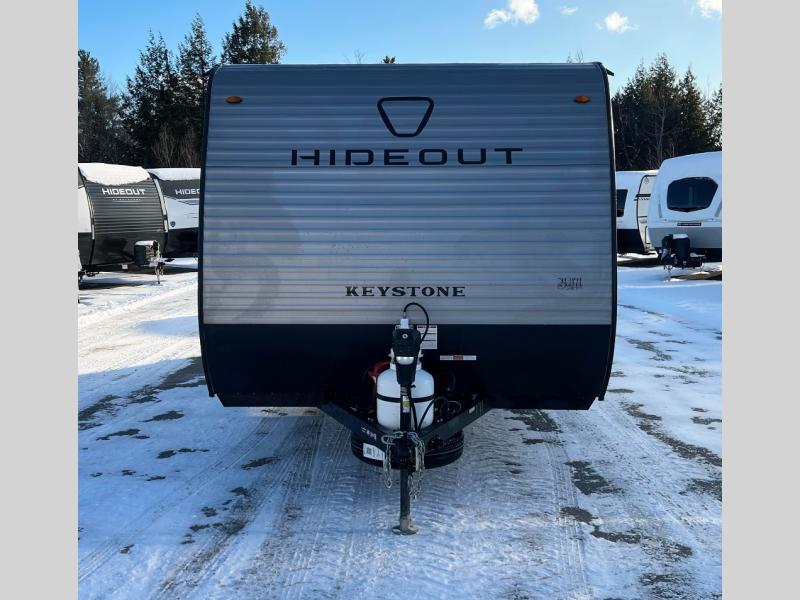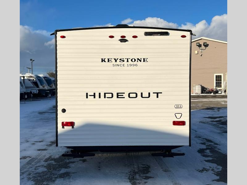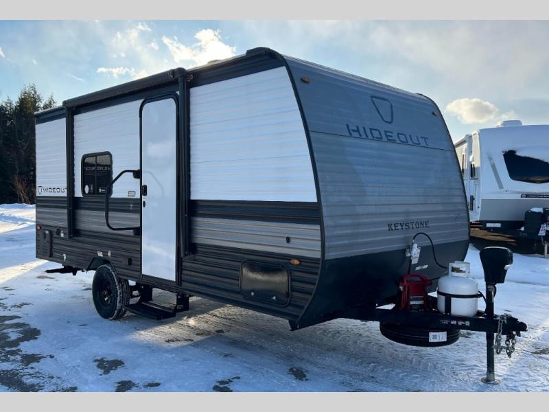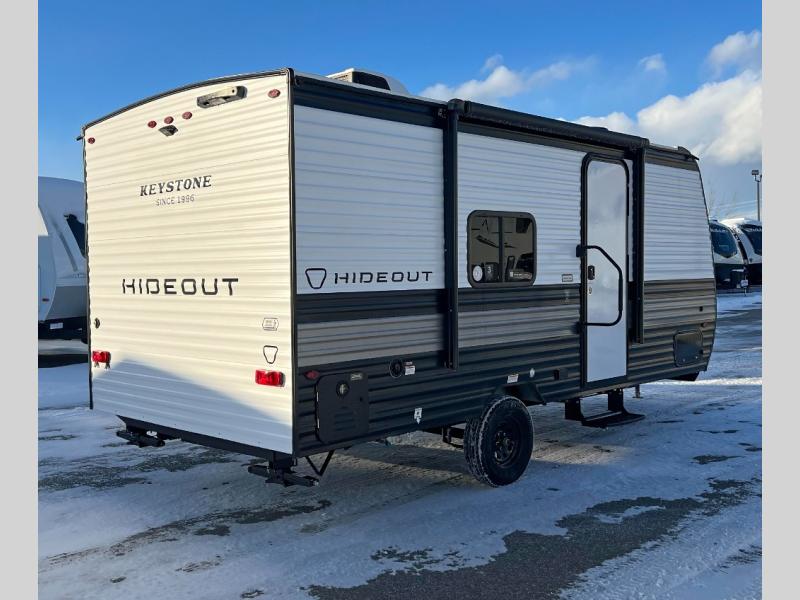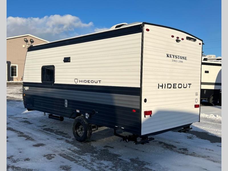With any Hideout Mini travel trailer by Keystone, you will enjoy lightweight towing thanks to their single axle! The XL tinted safety glass windows are ultra durable, and the power awning will provide protection from the sun as you relax in your camp chairs outside. Each model includes blackout night shades, LED lighting, plus many more interior comforts. There is also a 20K BTU furnace to keep you comfortable, plus a tankless water heater for endless hot showers!
