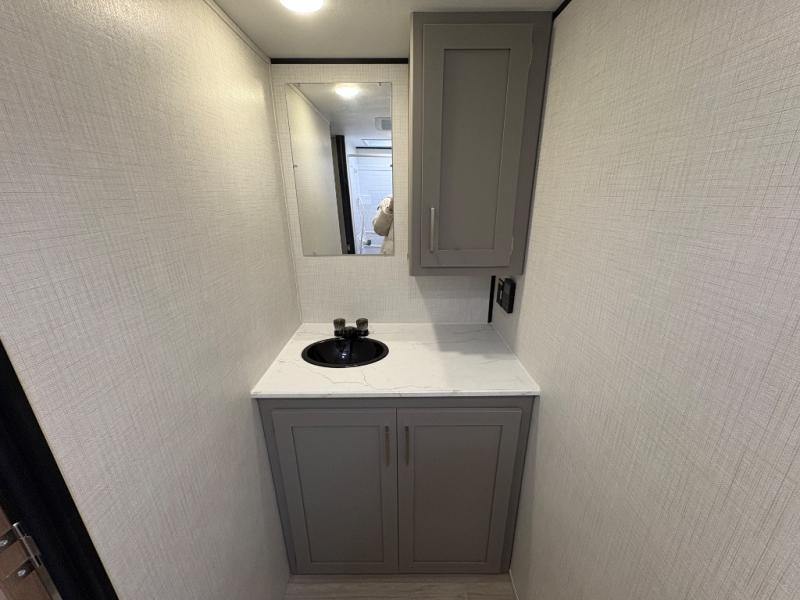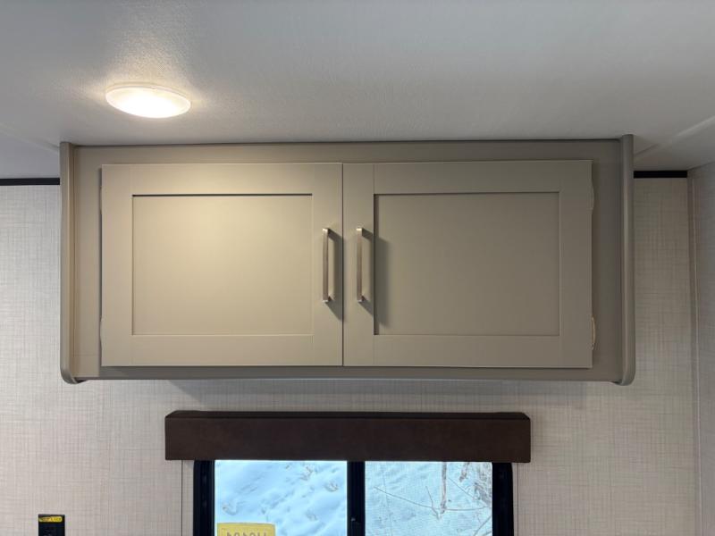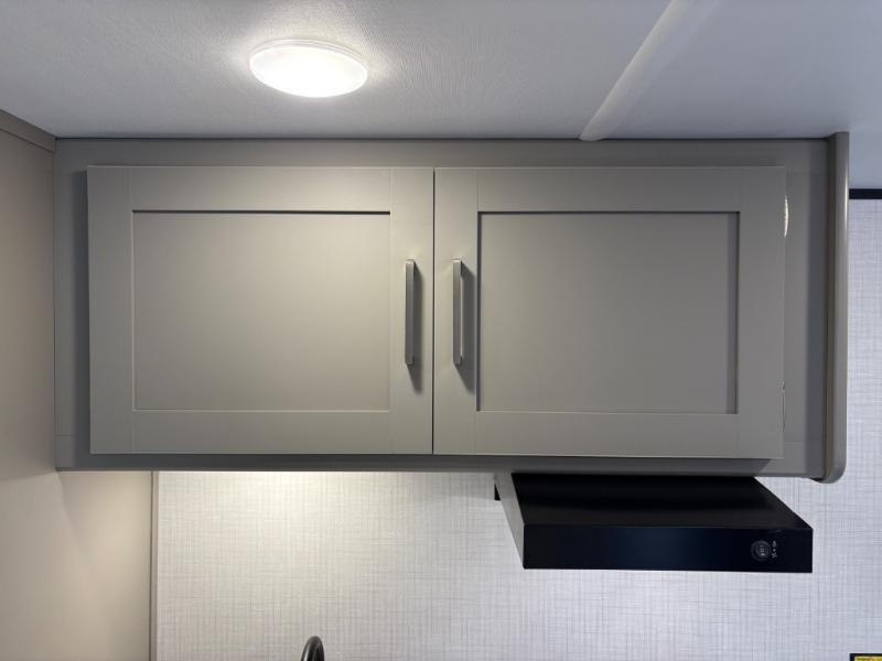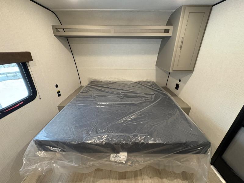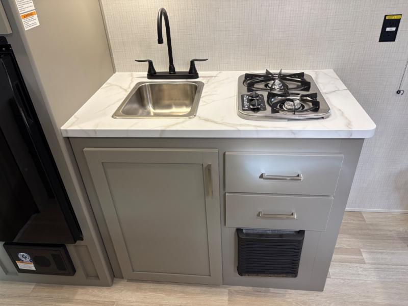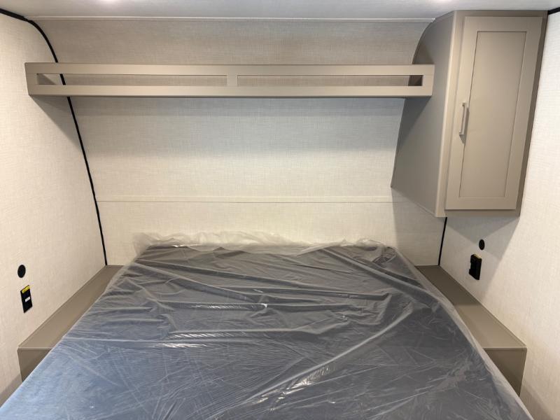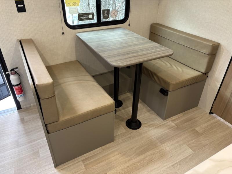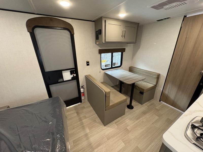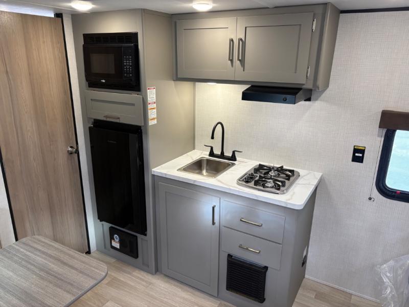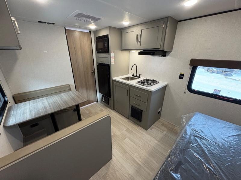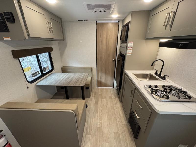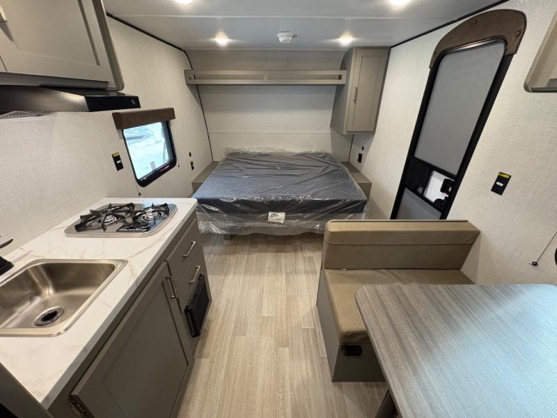 Camping trips just got easier travel trailer that can sleep three to four each night! There is a front Olympic RV queen bed with an overhead shelf and bedside wardrobe for your things. A two-burner cooktop and microwave oven will let you make breakfast for your crew, and a booth dinette provides a place to dine together, as well as convert to sleeping space for a guest or two little ones. This travel trailer also includes a full rear bath, complete with a shower, toilet, and vanity with a sink and overhead cabinet!