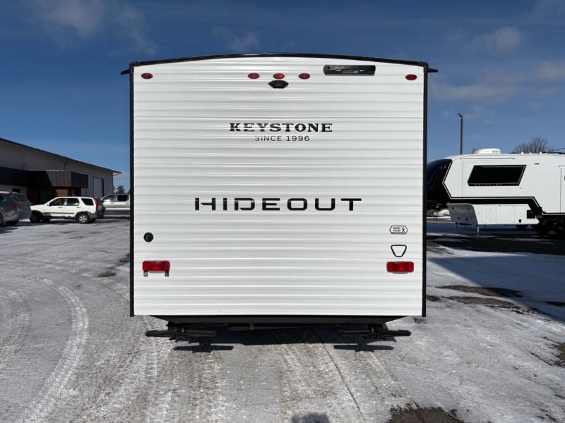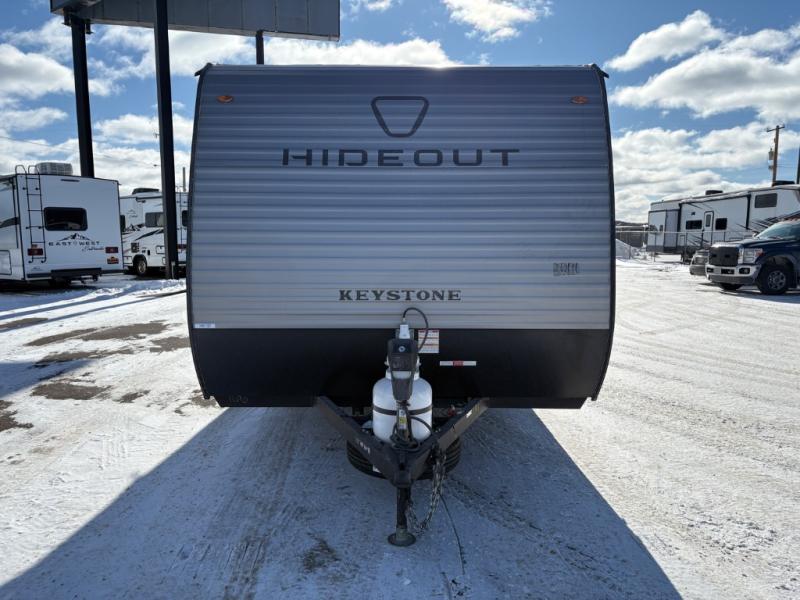 With any Hideout Mini travel trailer by Keystone, you will enjoy lightweight towing thanks to their single axle! The XL tinted safety glass windows are ultra durable, and the power awning will provide protection from the sun as you relax in your camp chairs outside. Each model includes blackout night shades, LED lighting, plus many more interior comforts. There is also a 20K BTU furnace to keep you comfortable, plus a tankless water heater for endless hot showers!