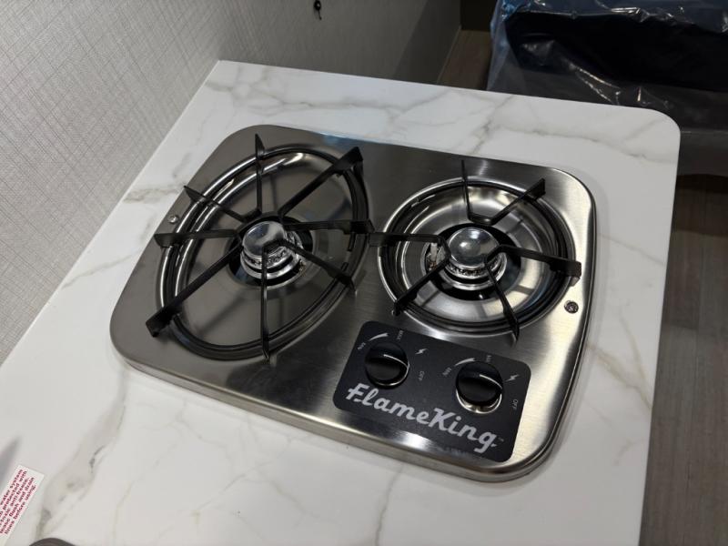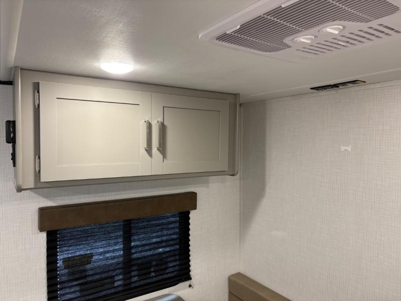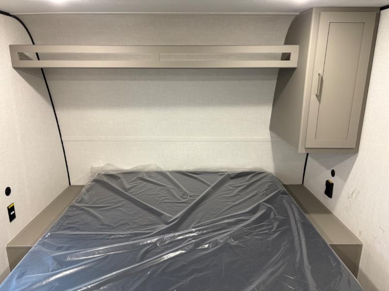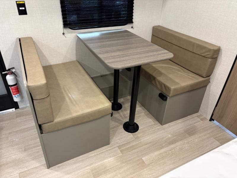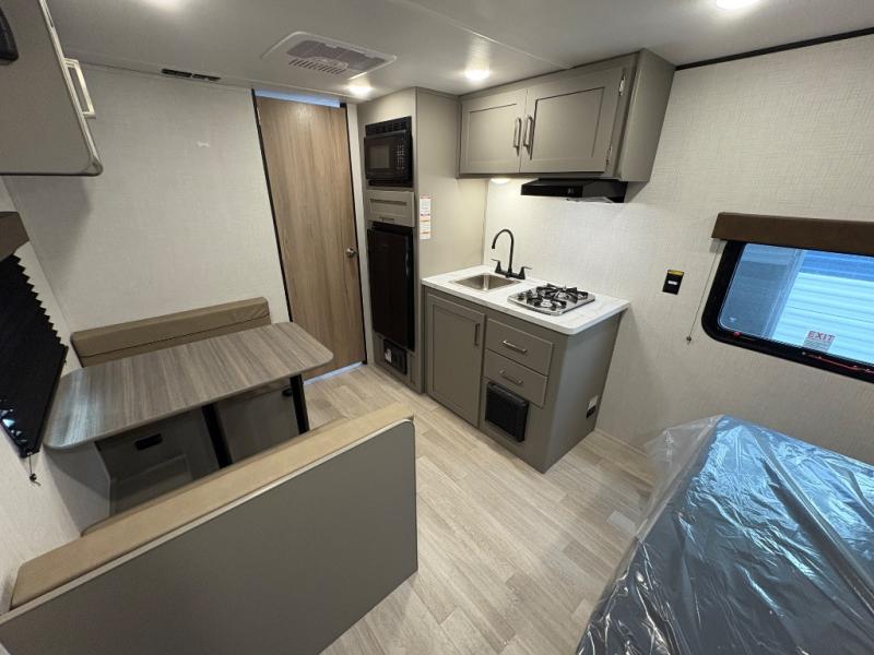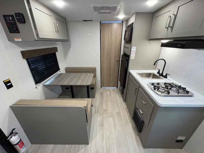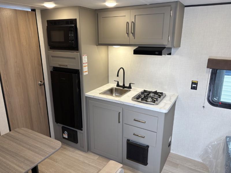 Camping trips just got easier travel trailer that can sleep three to four each night! There is a front Olympic RV queen bed with an overhead shelf and bedside wardrobe for your things. A two-burner cooktop and microwave oven will let you make breakfast for your crew, and a booth dinette provides a place to dine together, as well as convert to sleeping space for a guest or two little ones. This travel trailer also includes a full rear bath, complete with a shower, toilet, and vanity with a sink and overhead cabinet!