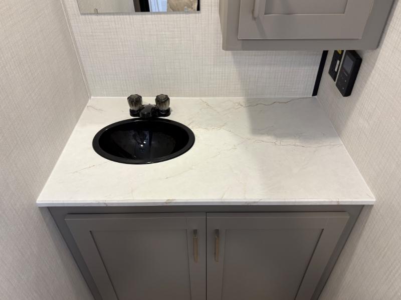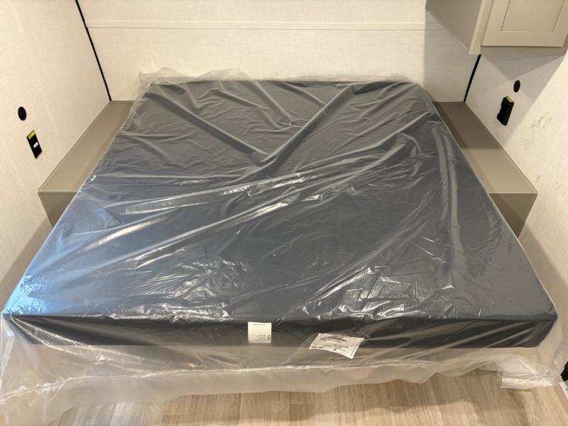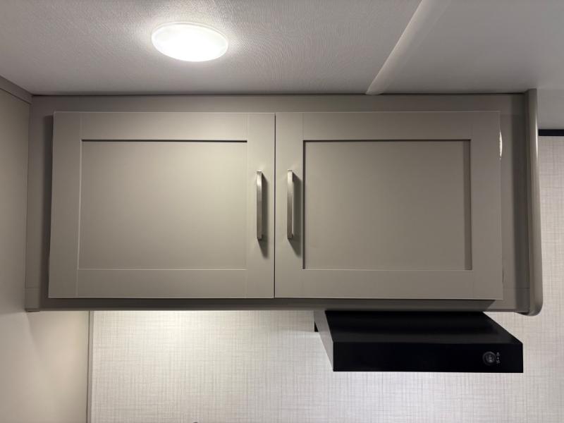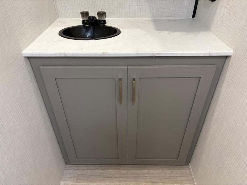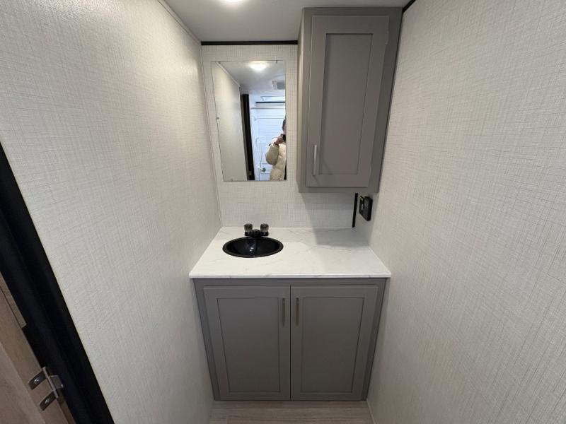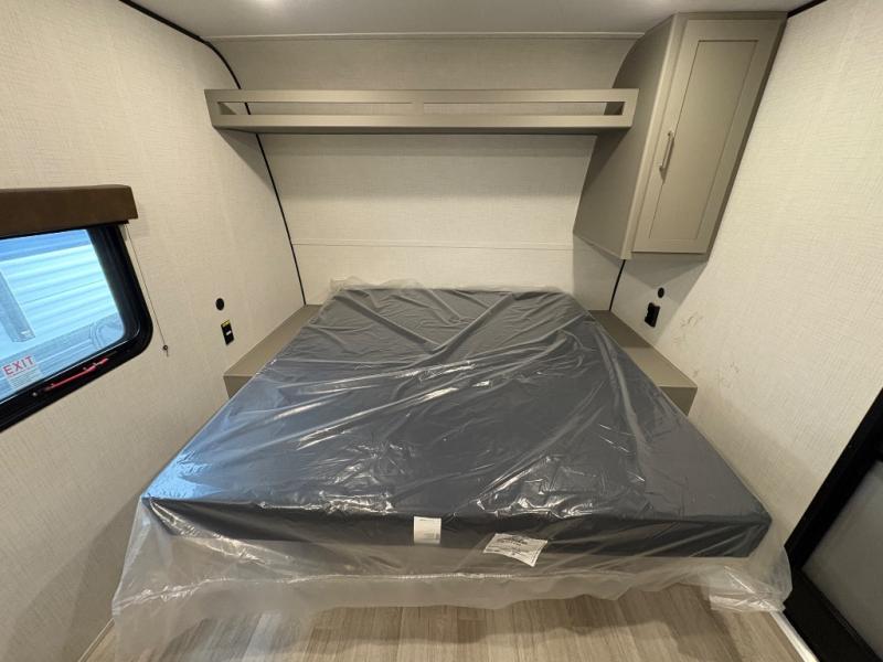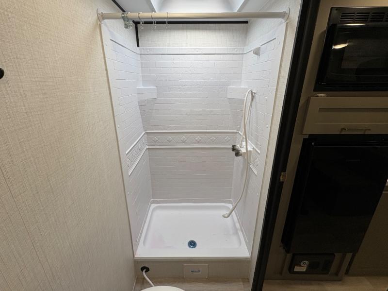 Camping trips just got easier travel trailer that can sleep three to four each night! There is a front Olympic RV queen bed with an overhead shelf and bedside wardrobe for your things. A two-burner cooktop and microwave oven will let you make breakfast for your crew, and a booth dinette provides a place to dine together, as well as convert to sleeping space for a guest or two little ones. This travel trailer also includes a full rear bath, complete with a shower, toilet, and vanity with a sink and overhead cabinet!