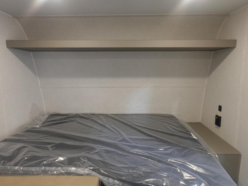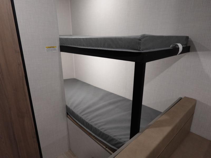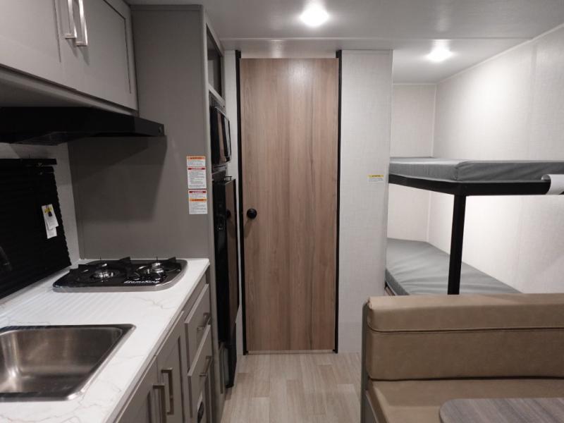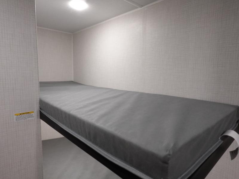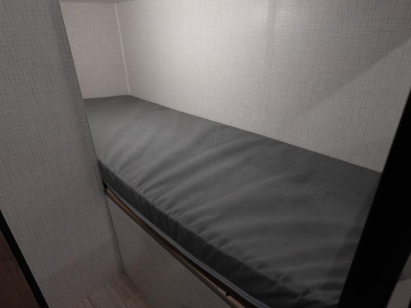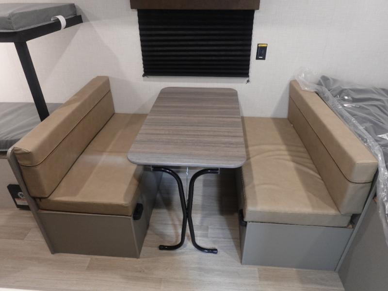 This trailer will fit perfectly for a group of five or less thanks to all the sleeping space! The owners will have a queen-size bed, and others can choose between the rear corner bunk beds or the booth dinette once set up for bedtime. There is a full bathroom for convenience when changing and getting cleaned up, a galley kitchen with a two burner cooktop plus a 3.3 cu. ft. refrigerator for the cold items. And you can stow your larger camping items in the exterior pass-through compartment.