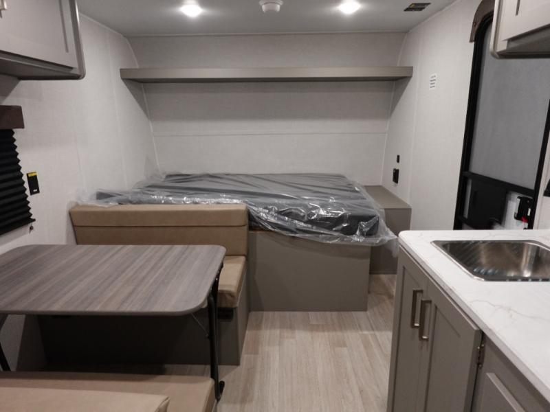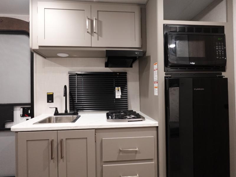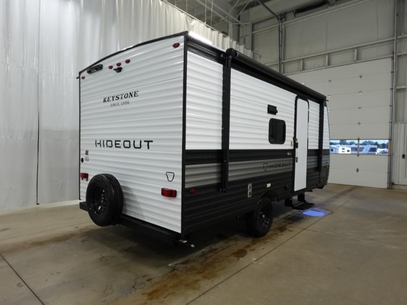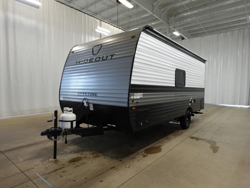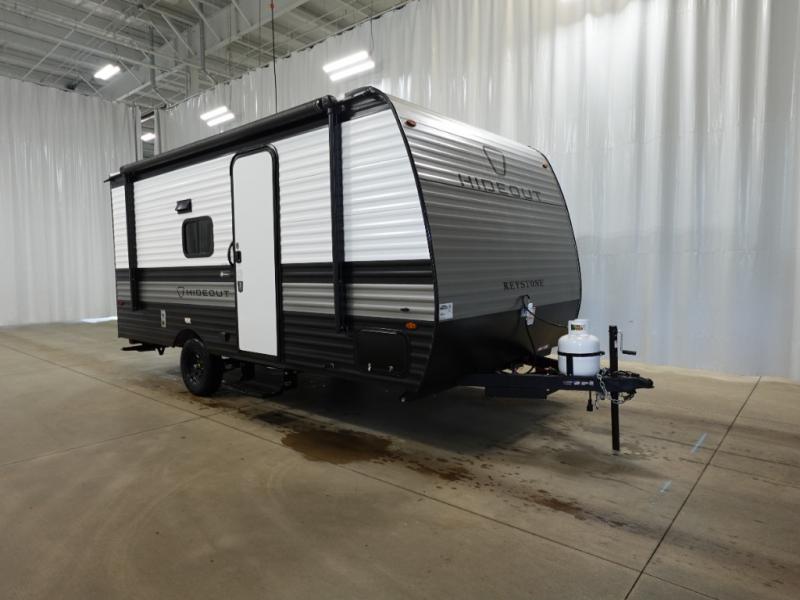 With any Hideout Mini travel trailer by Keystone, you will enjoy lightweight towing thanks to their single-axle! The AlphaPly TPO roof membrane is ultra durable, and the power awning will provide protection from the sun as you relax in your camp chairs outside. Each model includes blackout night shades, LED lighting, plus many more interior comforts. There is also a roof A/C and 20K BTU furnace to keep you comfortable, plus a tankless water heater for endless hot showers!