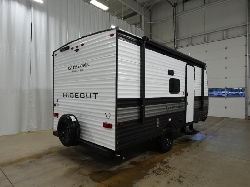 With any Hideout Mini travel trailer by Keystone, you will enjoy lightweight towing thanks to their single-axle! The AlphaPly TPO roof membrane is ultra durable, and the power awning will provide protection from the sun as you relax in your camp chairs outside. Each model includes blackout night shades, LED lighting, plus many more interior comforts. There is also a roof A/C and 20K BTU furnace to keep you comfortable, plus a tankless water heater for endless hot showers!