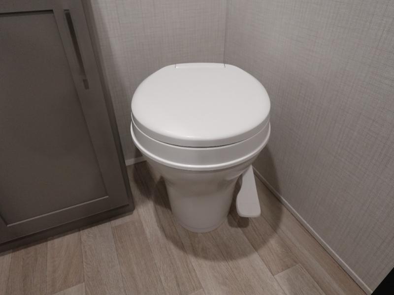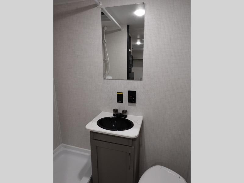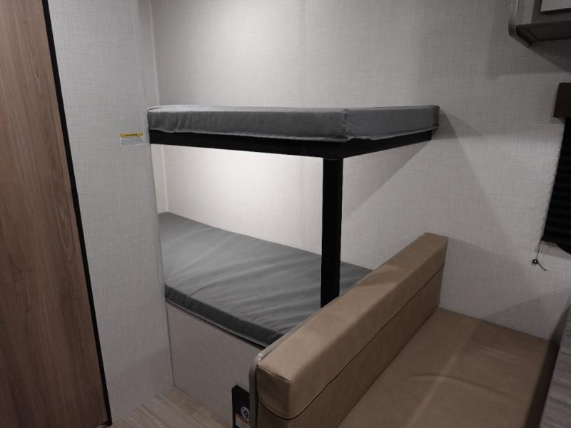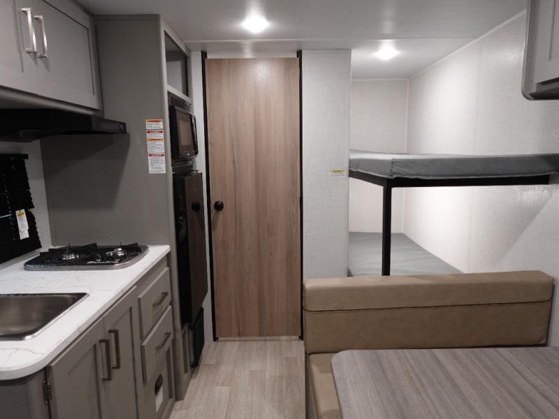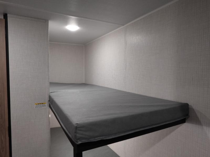 This trailer will fit perfectly for a group of five or less thanks to all the sleeping space! The owners will have a queen-size bed, and others can choose between the rear corner bunk beds or the booth dinette once set up for bedtime. There is a full bathroom for convenience when changing and getting cleaned up, a galley kitchen with a two burner cooktop plus a 3.3 cu. ft. refrigerator for the cold items. And you can stow your larger camping items in the exterior pass-through compartment.