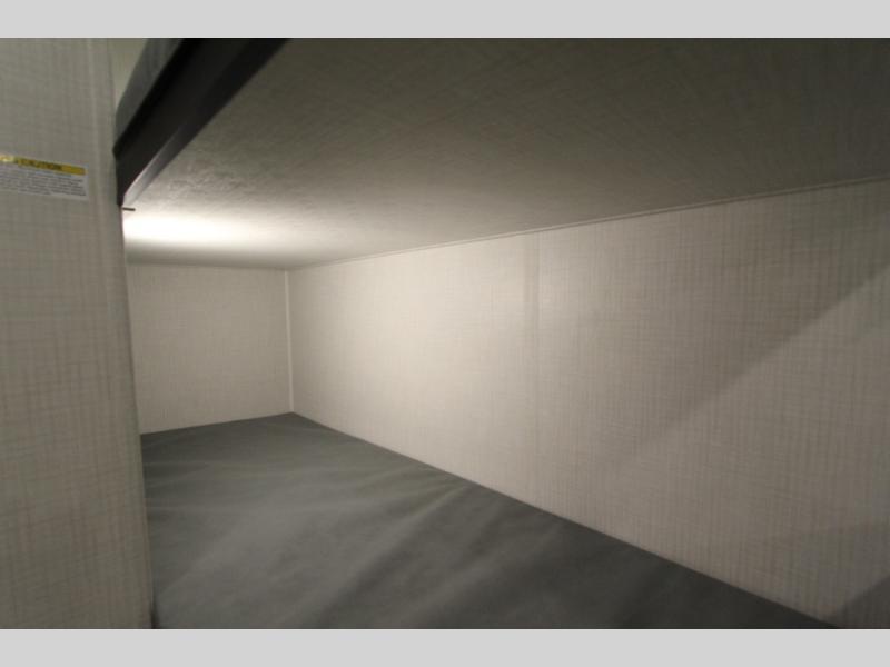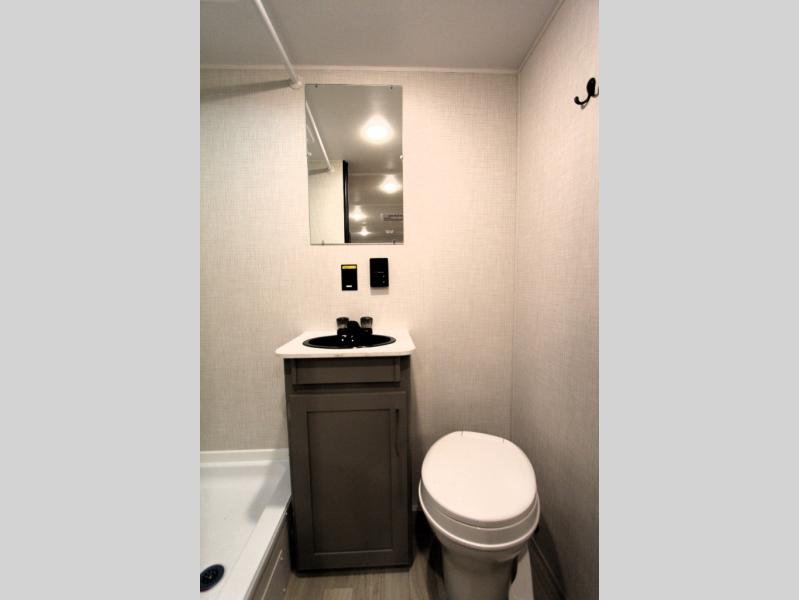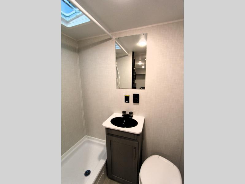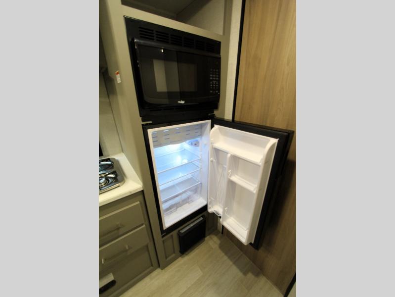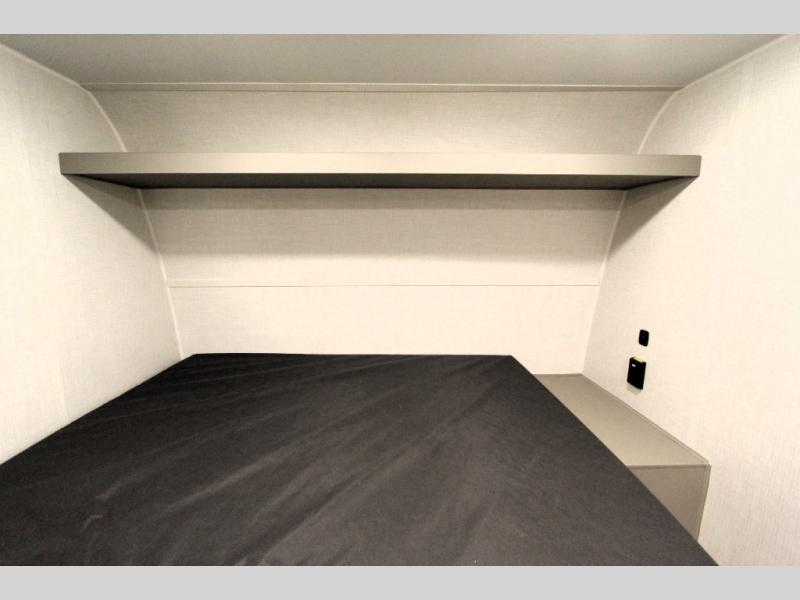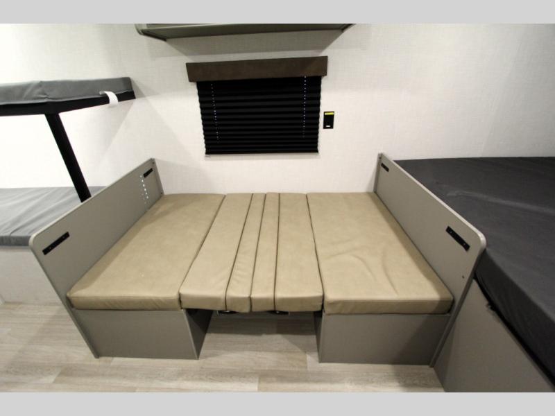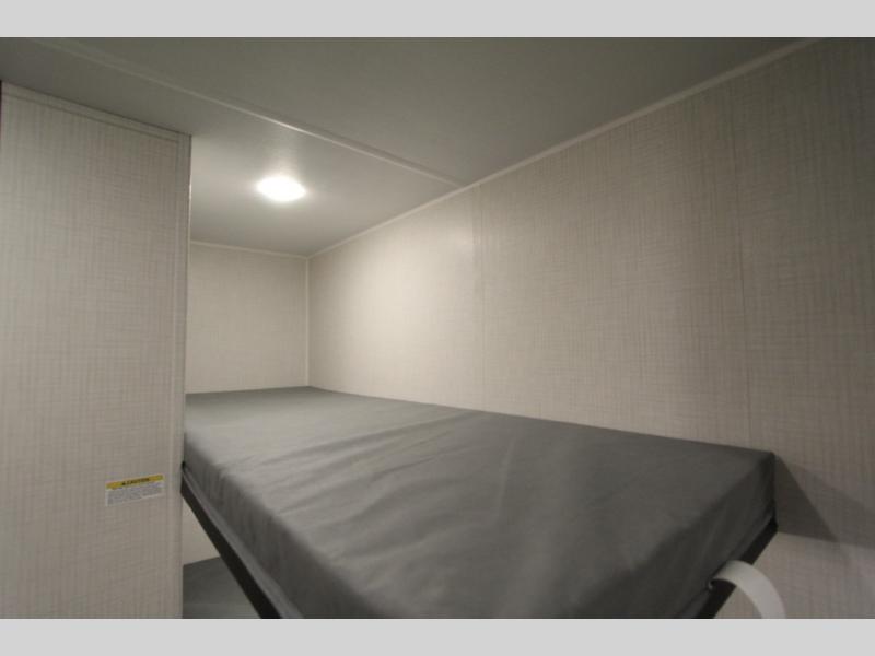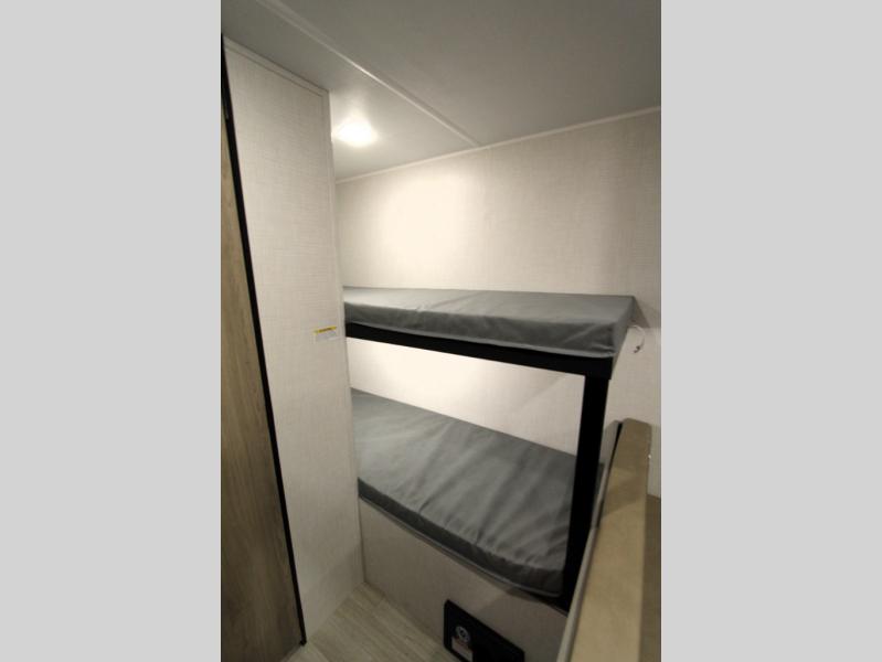 This trailer will fit perfectly for a group of five or less thanks to all the sleeping space! The owners will have a queen-size bed, and others can choose between the rear corner bunk beds or the booth dinette once set up for bedtime. There is a full bathroom for convenience when changing and getting cleaned up, a galley kitchen with a two burner cooktop plus a 3.3 cu. ft. refrigerator for the cold items. And you can stow your larger camping items in the exterior pass-through compartment.