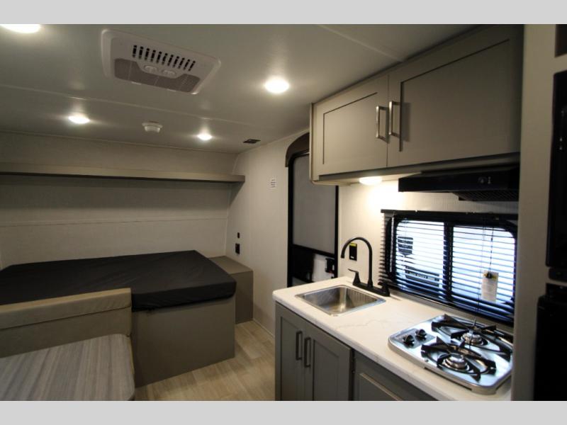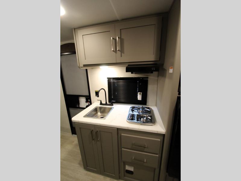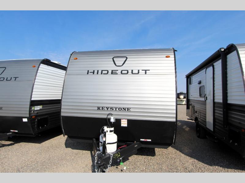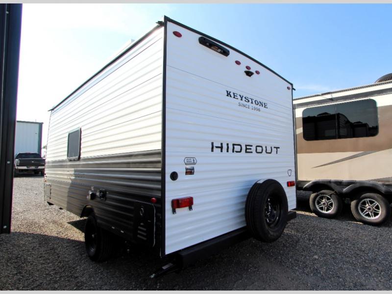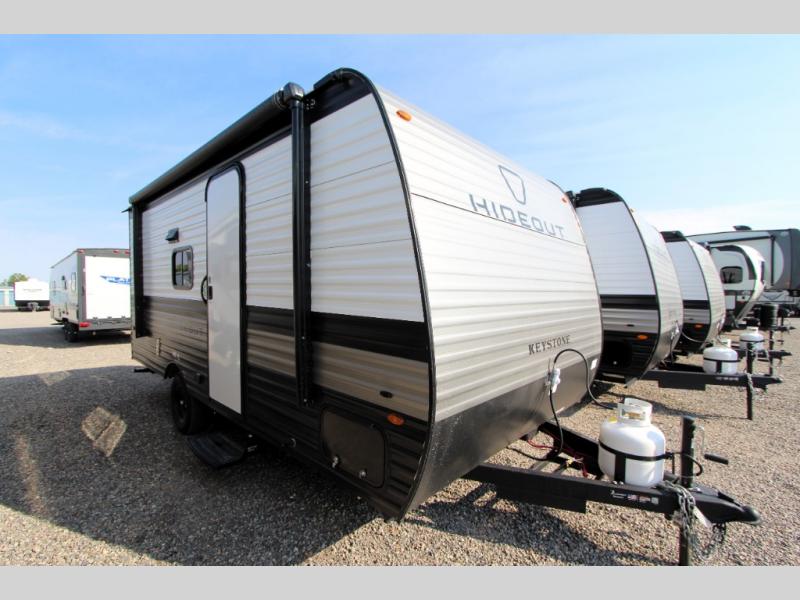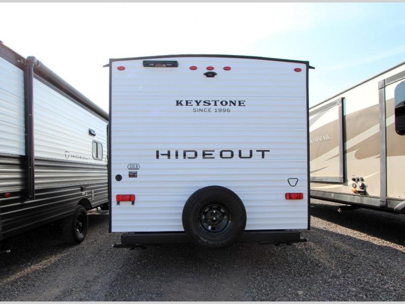 With any Hideout Mini travel trailer by Keystone, you will enjoy lightweight towing thanks to their single-axle! The AlphaPly TPO roof membrane is ultra durable, and the power awning will provide protection from the sun as you relax in your camp chairs outside. Each model includes blackout night shades, LED lighting, plus many more interior comforts. There is also a roof A/C and 20K BTU furnace to keep you comfortable, plus a tankless water heater for endless hot showers!