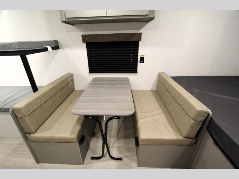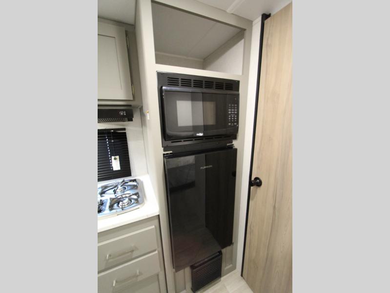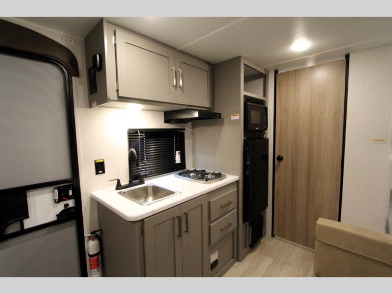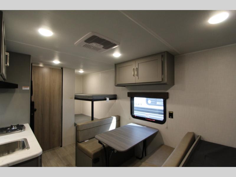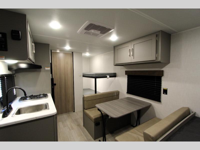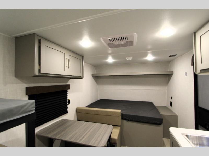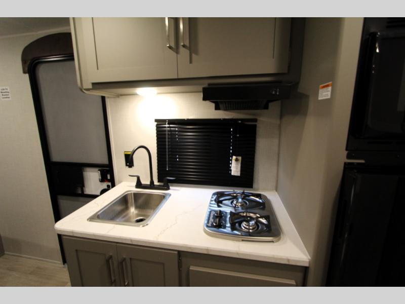 With any Hideout Mini travel trailer by Keystone, you will enjoy lightweight towing thanks to their single-axle! The AlphaPly TPO roof membrane is ultra durable, and the power awning will provide protection from the sun as you relax in your camp chairs outside. Each model includes blackout night shades, LED lighting, plus many more interior comforts. There is also a roof A/C and 20K BTU furnace to keep you comfortable, plus a tankless water heater for endless hot showers!
