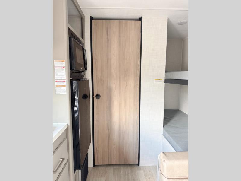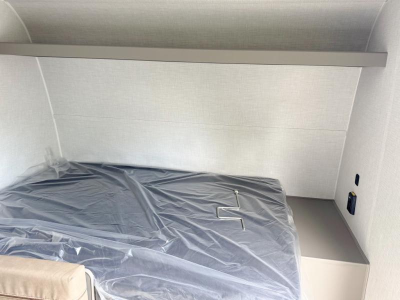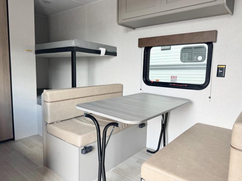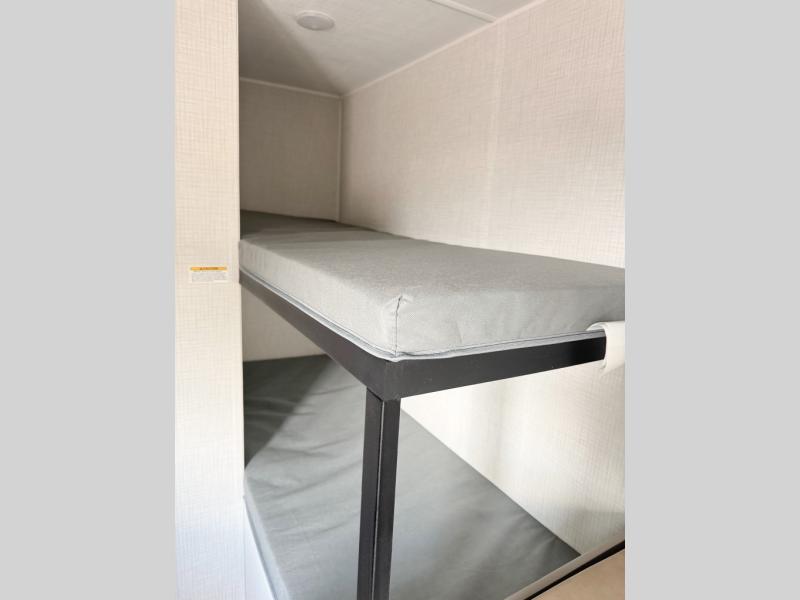 This trailer will fit perfectly for a group of five or less thanks to all the sleeping space! The owners will have a queen-size bed, and others can choose between the rear corner bunk beds or the booth dinette once set up for bedtime. There is a full bathroom for convenience when changing and getting cleaned up, a galley kitchen with a two burner cooktop plus a 3.3 cu. ft. refrigerator for the cold items. And you can stow your larger camping items in the exterior pass-through compartment.