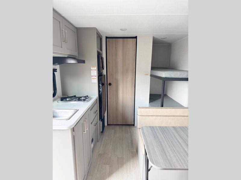 This trailer will fit perfectly for a group of five or less thanks to all the sleeping space! The owners will have a queen-size bed, and others can choose between the rear corner bunk beds or the booth dinette once set up for bedtime. There is a full bathroom for convenience when changing and getting cleaned up, a galley kitchen with a two burner cooktop plus a 3.3 cu. ft. refrigerator for the cold items. And you can stow your larger camping items in the exterior pass-through compartment.