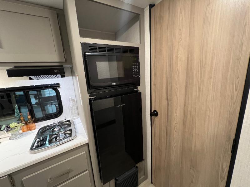 With any Hideout Mini travel trailer by Keystone, you will enjoy lightweight towing thanks to their single-axle! The AlphaPly TPO roof membrane is ultra durable, and the power awning will provide protection from the sun as you relax in your camp chairs outside. Each model includes blackout night shades, LED lighting, plus many more interior comforts. There is also a roof A/C and 20K BTU furnace to keep you comfortable, plus a tankless water heater for endless hot showers!