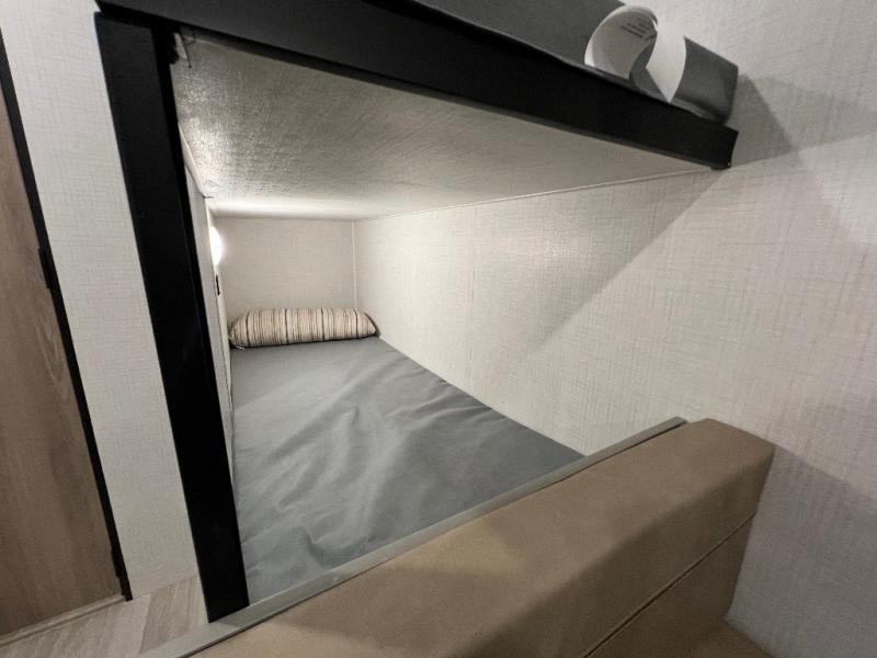 This trailer will fit perfectly for a group of five or less thanks to all the sleeping space! The owners will have a queen-size bed, and others can choose between the rear corner bunk beds or the booth dinette once set up for bedtime. There is a full bathroom for convenience when changing and getting cleaned up, a galley kitchen with a two burner cooktop plus a 3.3 cu. ft. refrigerator for the cold items. And you can stow your larger camping items in the exterior pass-through compartment.