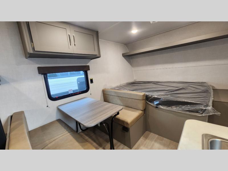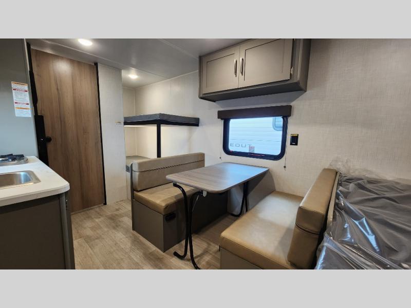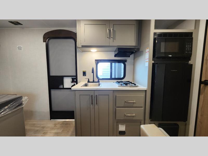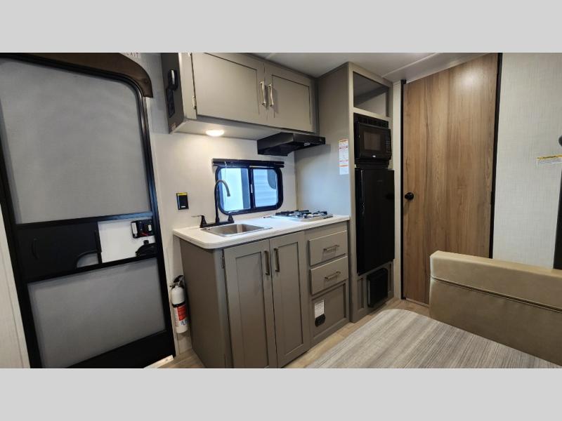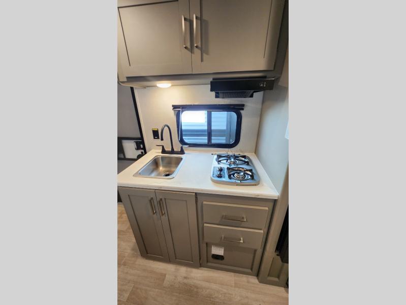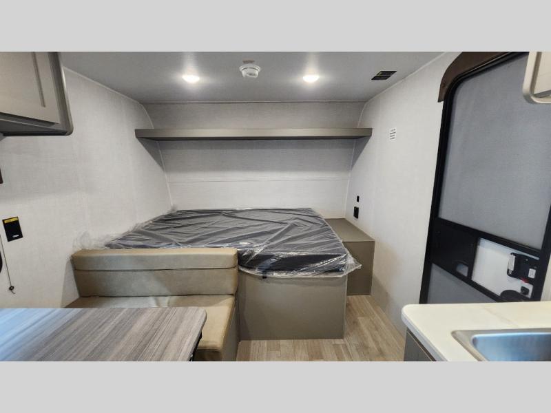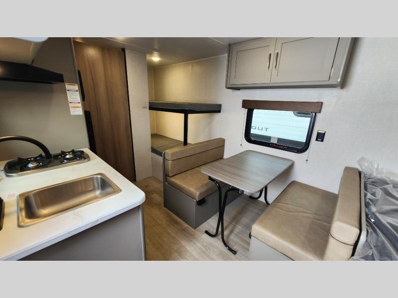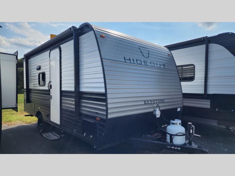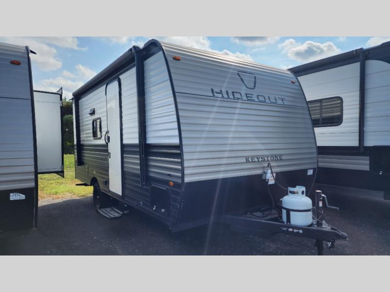 With any Hideout Mini travel trailer by Keystone, you will enjoy lightweight towing thanks to their single-axle! The AlphaPly TPO roof membrane is ultra durable, and the power awning will provide protection from the sun as you relax in your camp chairs outside. Each model includes blackout night shades, LED lighting, plus many more interior comforts. There is also a roof A/C and 20K BTU furnace to keep you comfortable, plus a tankless water heater for endless hot showers!