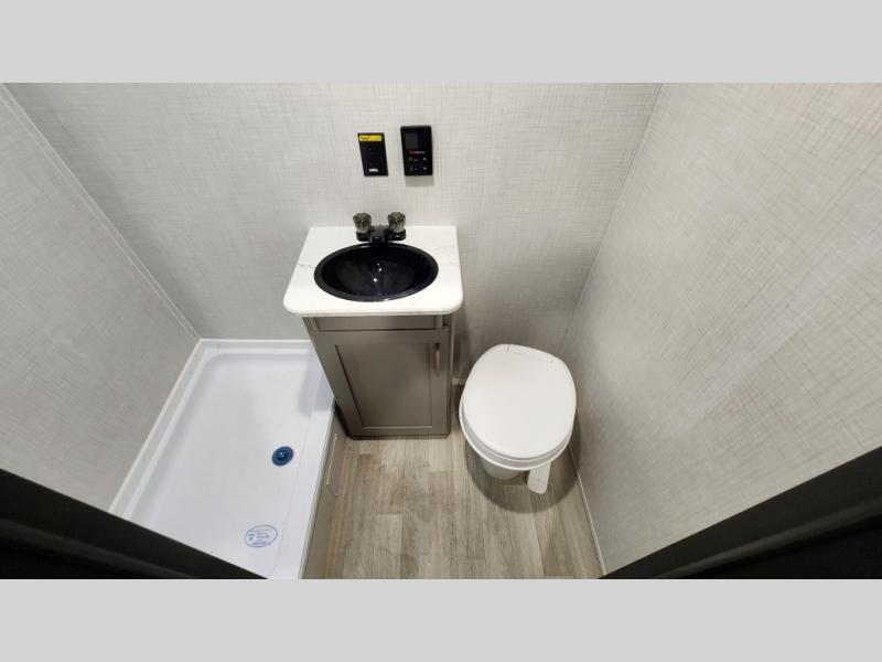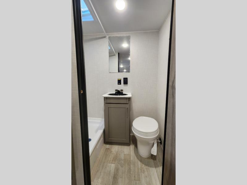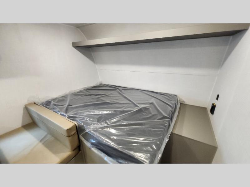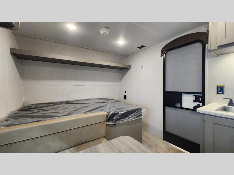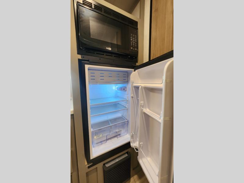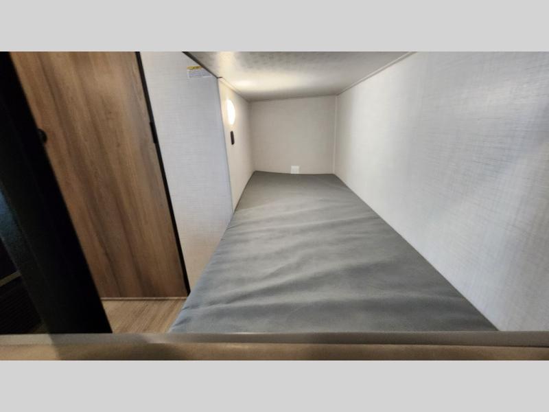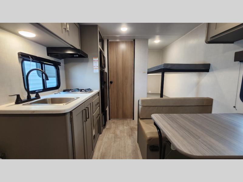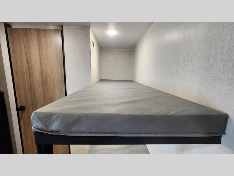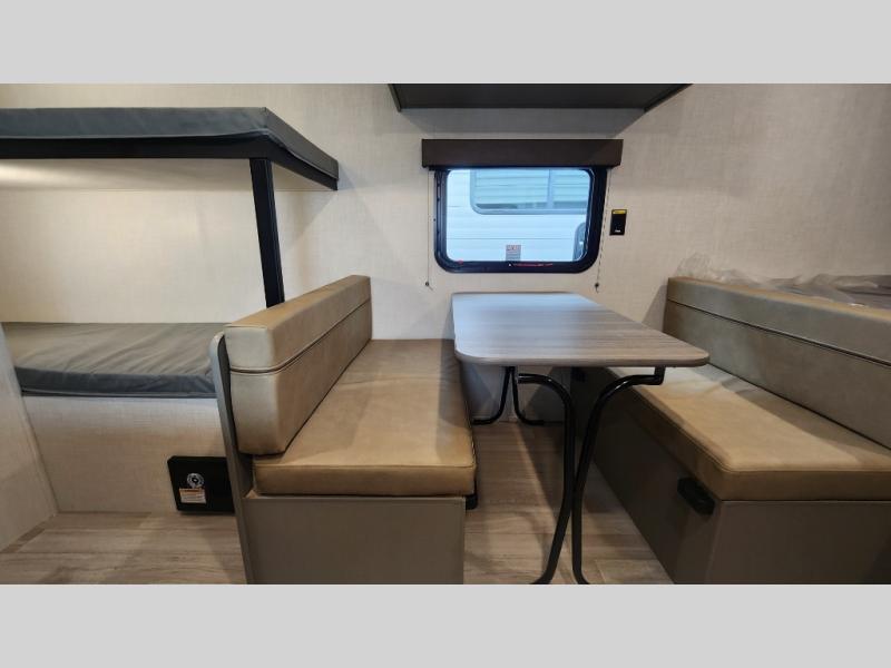 This trailer will fit perfectly for a group of five or less thanks to all the sleeping space! The owners will have a queen-size bed, and others can choose between the rear corner bunk beds or the booth dinette once set up for bedtime. There is a full bathroom for convenience when changing and getting cleaned up, a galley kitchen with a two burner cooktop plus a 3.3 cu. ft. refrigerator for the cold items. And you can stow your larger camping items in the exterior pass-through compartment.