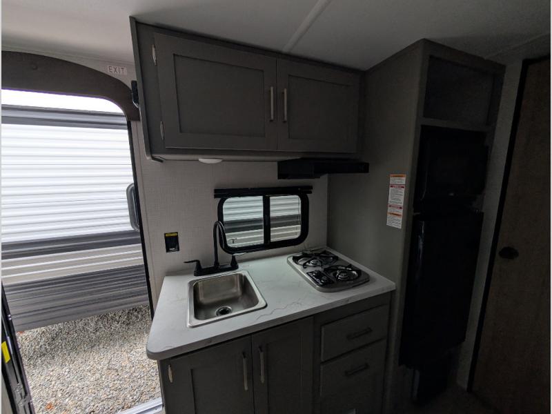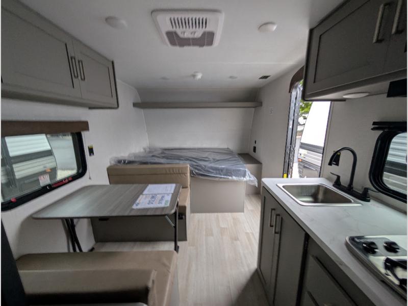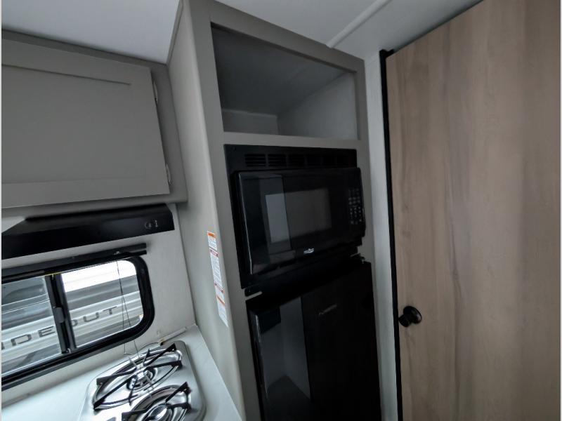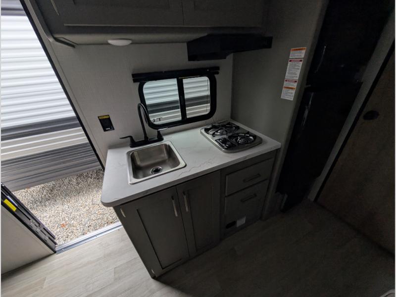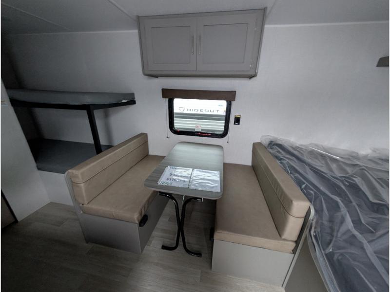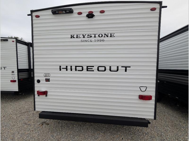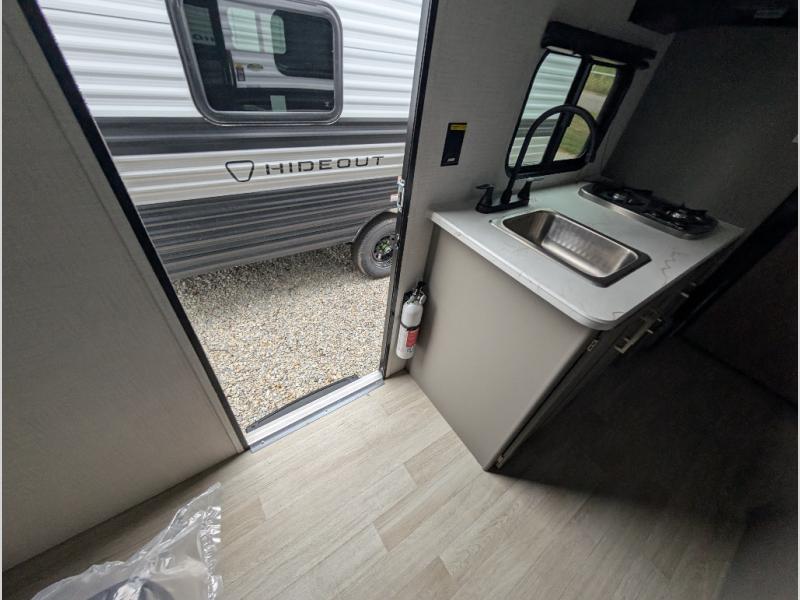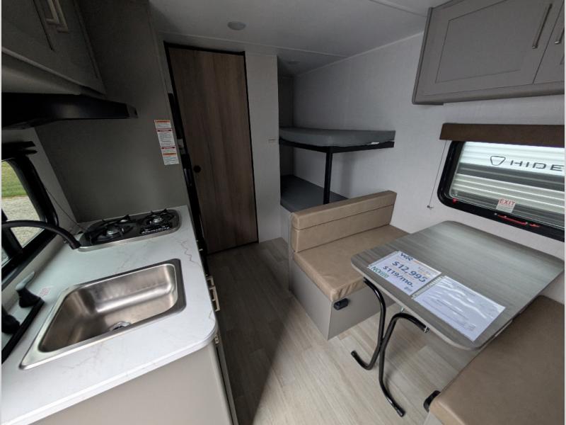 With any Hideout Mini travel trailer by Keystone, you will enjoy lightweight towing thanks to their single-axle! The AlphaPly TPO roof membrane is ultra durable, and the power awning will provide protection from the sun as you relax in your camp chairs outside. Each model includes blackout night shades, LED lighting, plus many more interior comforts. There is also a roof A/C and 20K BTU furnace to keep you comfortable, plus a tankless water heater for endless hot showers!