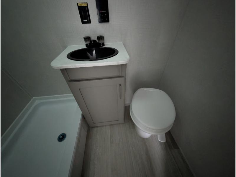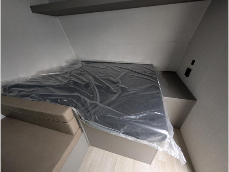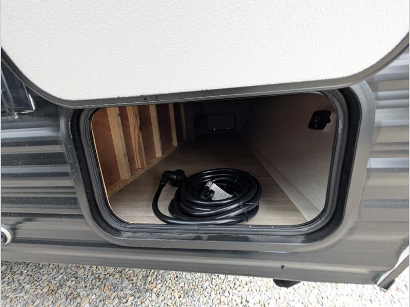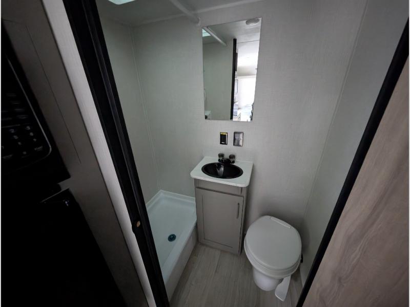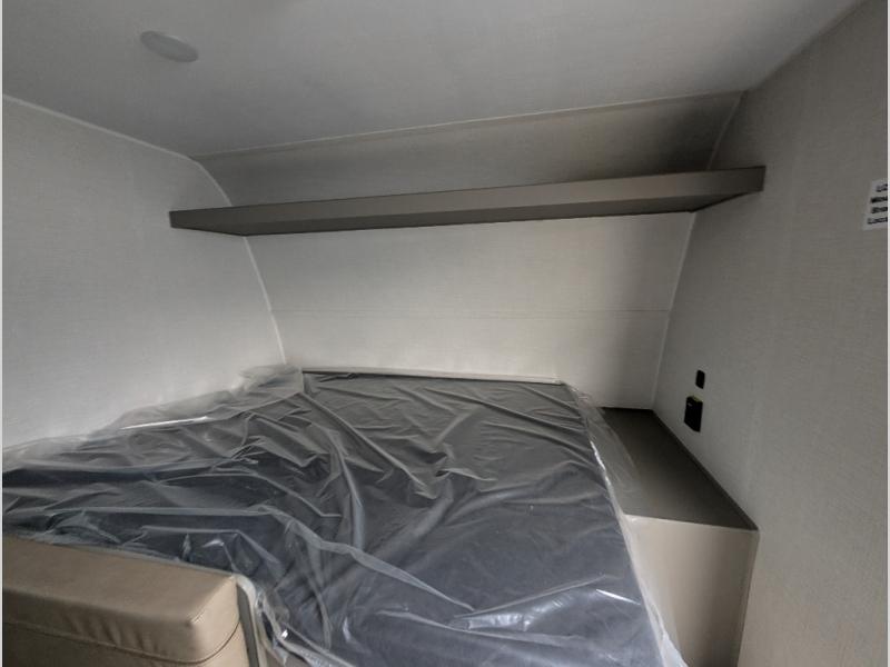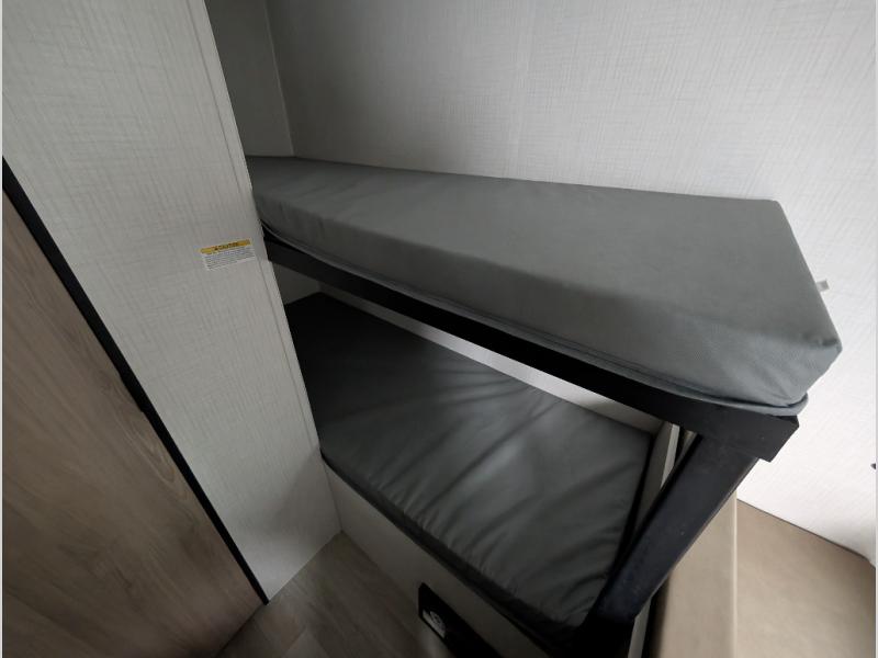 This trailer will fit perfectly for a group of five or less thanks to all the sleeping space! The owners will have a queen-size bed, and others can choose between the rear corner bunk beds or the booth dinette once set up for bedtime. There is a full bathroom for convenience when changing and getting cleaned up, a galley kitchen with a two burner cooktop plus a 3.3 cu. ft. refrigerator for the cold items. And you can stow your larger camping items in the exterior pass-through compartment.