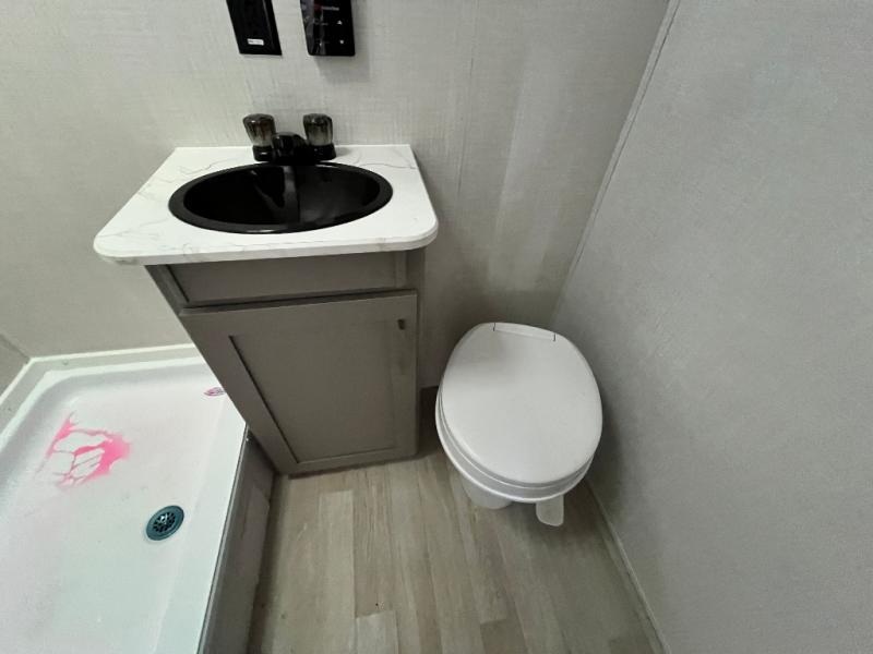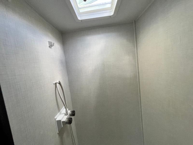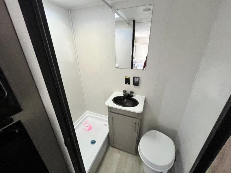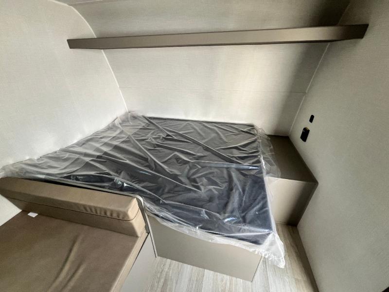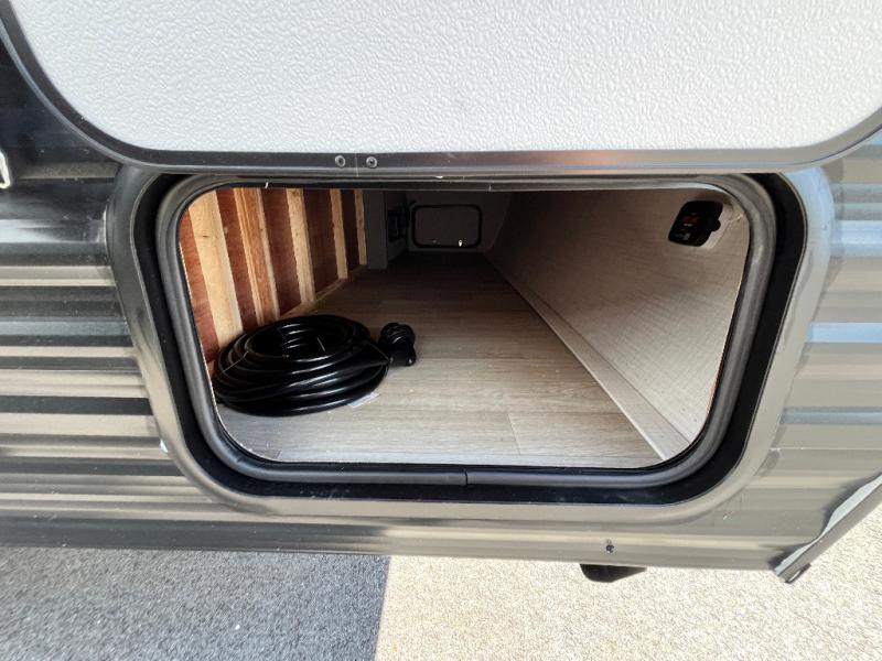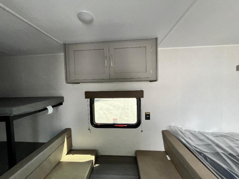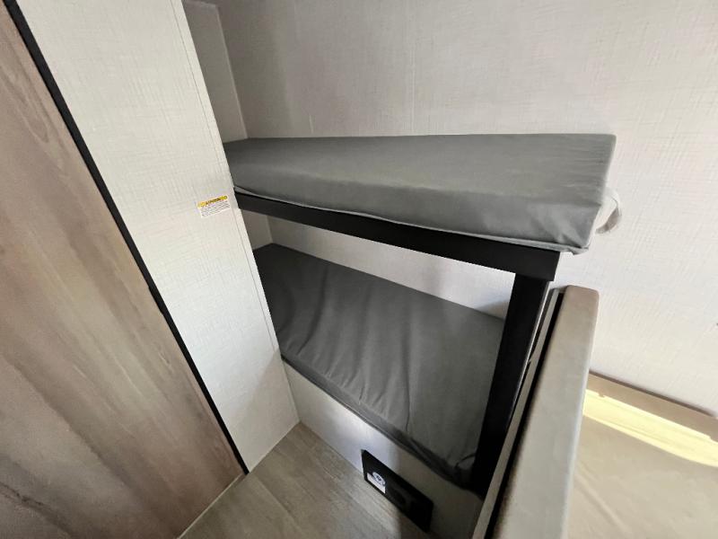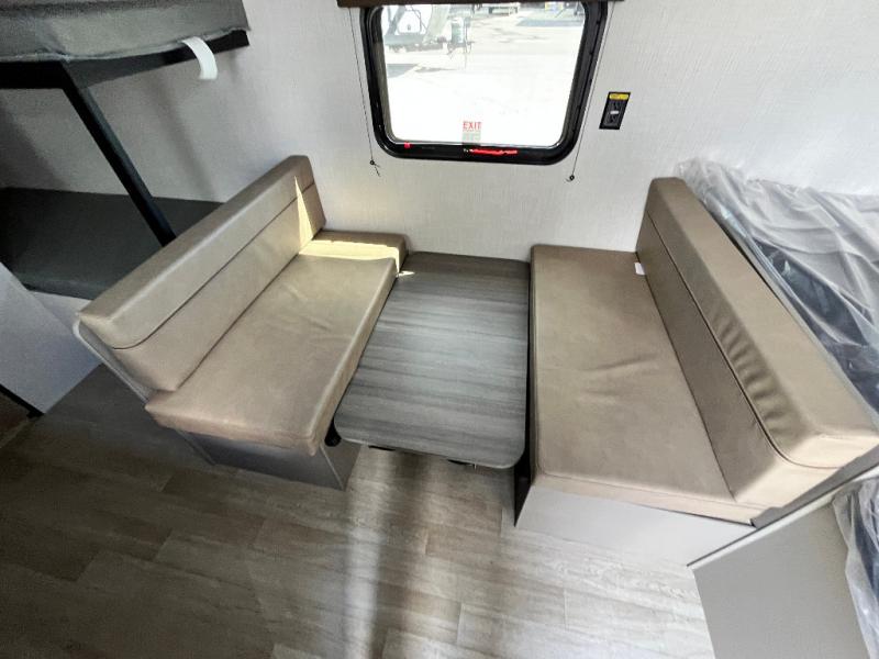 This trailer will fit perfectly for a group of five or less thanks to all the sleeping space! The owners will have a queen-size bed, and others can choose between the rear corner bunk beds or the booth dinette once set up for bedtime. There is a full bathroom for convenience when changing and getting cleaned up, a galley kitchen with a two burner cooktop plus a 3.3 cu. ft. refrigerator for the cold items. And you can stow your larger camping items in the exterior pass-through compartment.