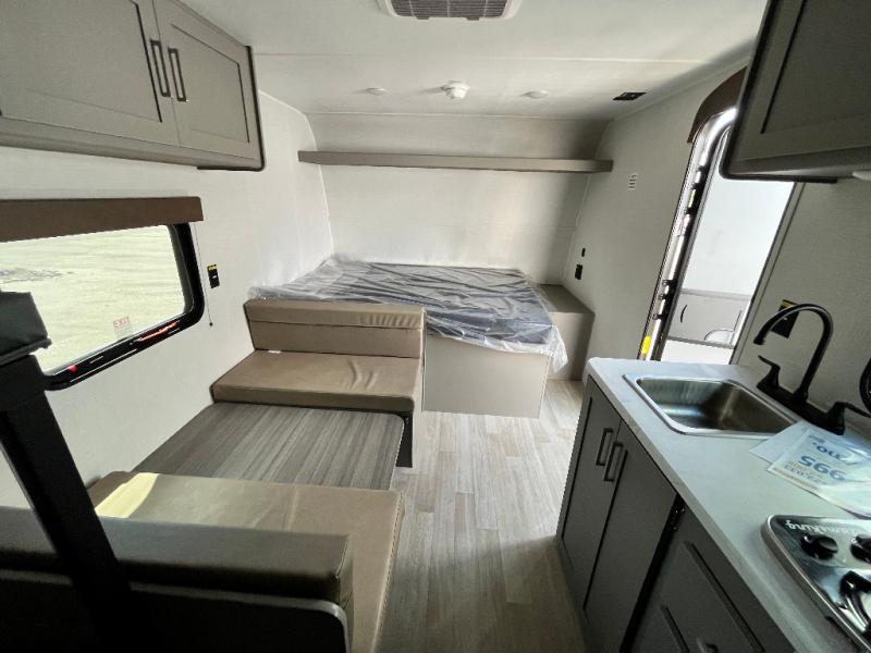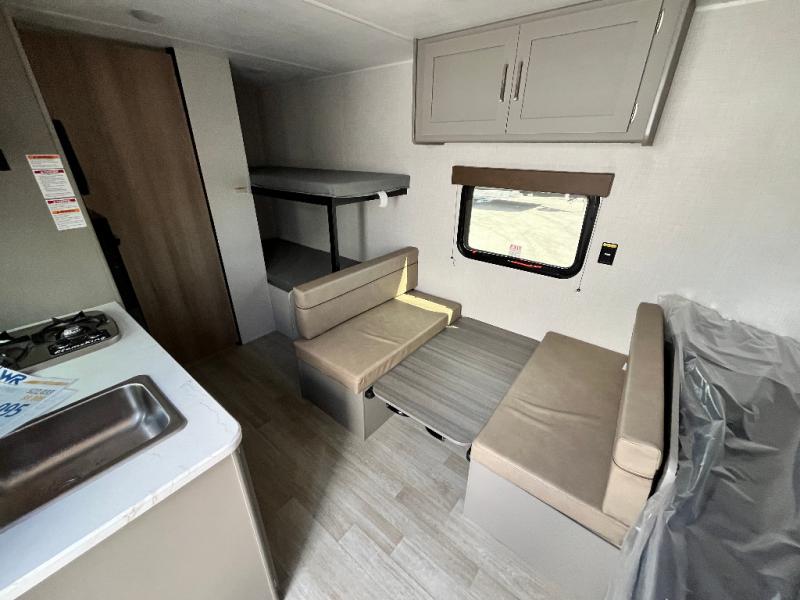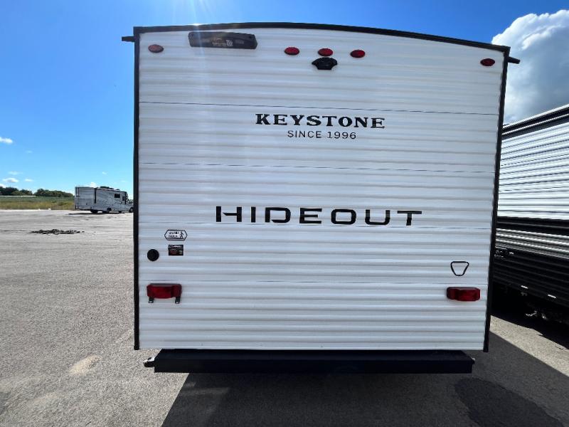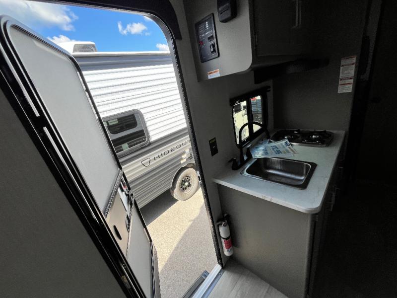 With any Hideout Mini travel trailer by Keystone, you will enjoy lightweight towing thanks to their single-axle! The AlphaPly TPO roof membrane is ultra durable, and the power awning will provide protection from the sun as you relax in your camp chairs outside. Each model includes blackout night shades, LED lighting, plus many more interior comforts. There is also a roof A/C and 20K BTU furnace to keep you comfortable, plus a tankless water heater for endless hot showers!