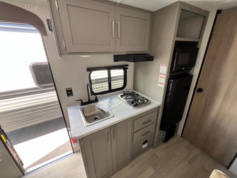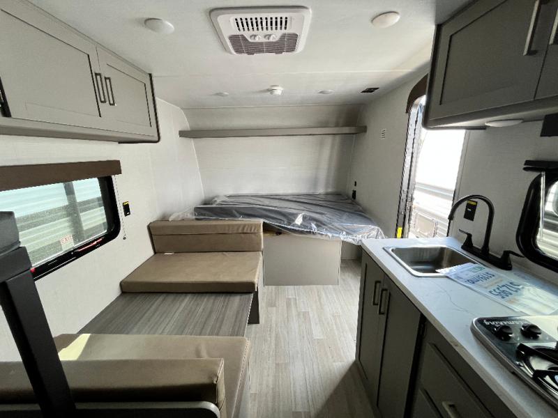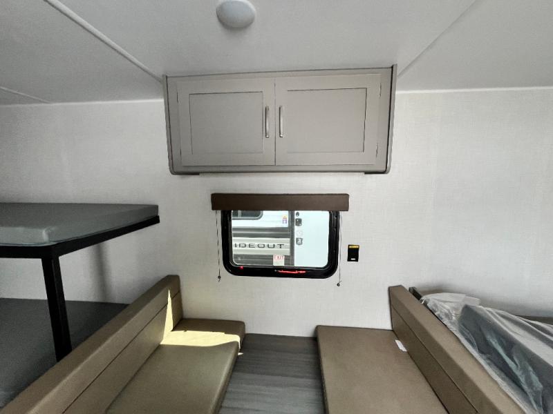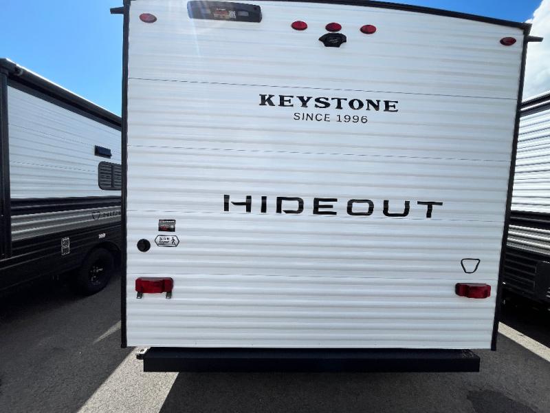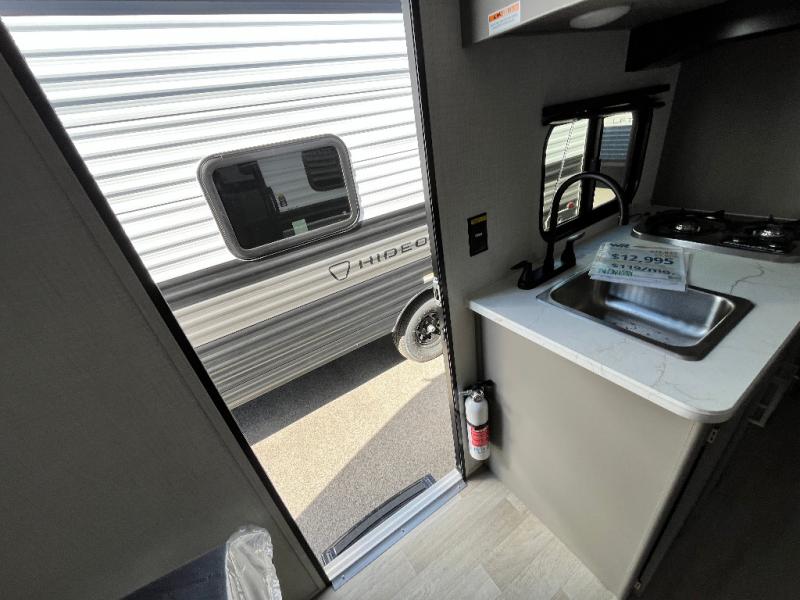 With any Hideout Mini travel trailer by Keystone, you will enjoy lightweight towing thanks to their single-axle! The AlphaPly TPO roof membrane is ultra durable, and the power awning will provide protection from the sun as you relax in your camp chairs outside. Each model includes blackout night shades, LED lighting, plus many more interior comforts. There is also a roof A/C and 20K BTU furnace to keep you comfortable, plus a tankless water heater for endless hot showers!