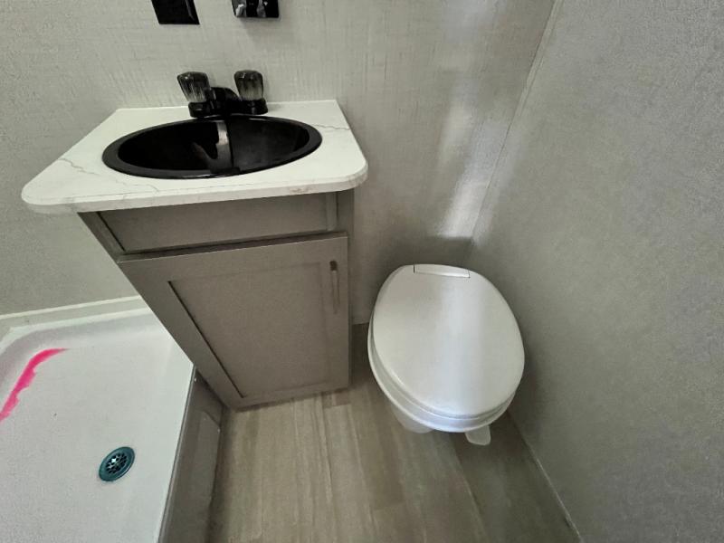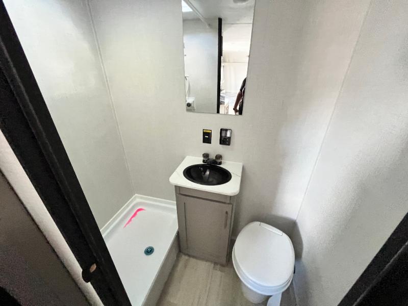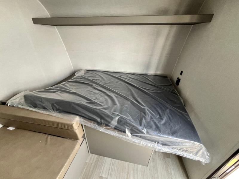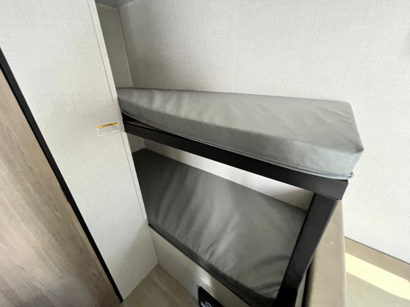 This trailer will fit perfectly for a group of five or less thanks to all the sleeping space! The owners will have a queen-size bed, and others can choose between the rear corner bunk beds or the booth dinette once set up for bedtime. There is a full bathroom for convenience when changing and getting cleaned up, a galley kitchen with a two burner cooktop plus a 3.3 cu. ft. refrigerator for the cold items. And you can stow your larger camping items in the exterior pass-through compartment.