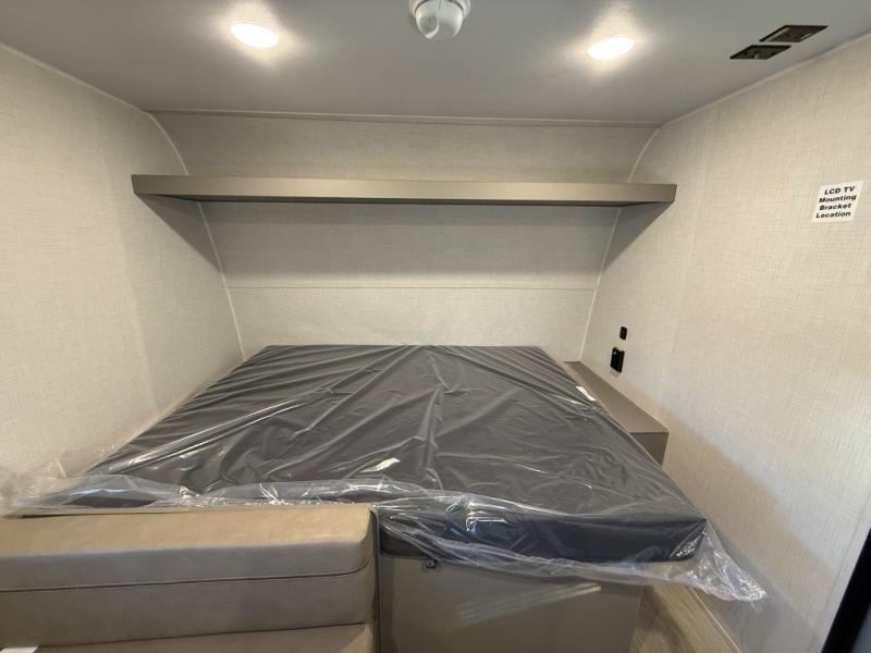 This trailer will fit perfectly for a group of five or less thanks to all the sleeping space! The owners will have a queen-size bed, and others can choose between the rear corner bunk beds or the booth dinette once set up for bedtime. There is a full bathroom for convenience when changing and getting cleaned up, a galley kitchen with a two burner cooktop plus a 3.3 cu. ft. refrigerator for the cold items. And you can stow your larger camping items in the exterior pass-through compartment.