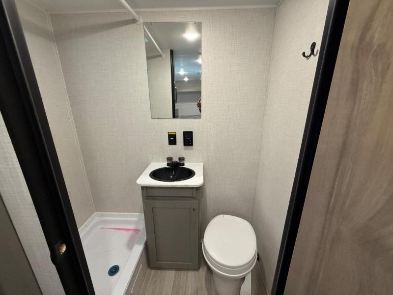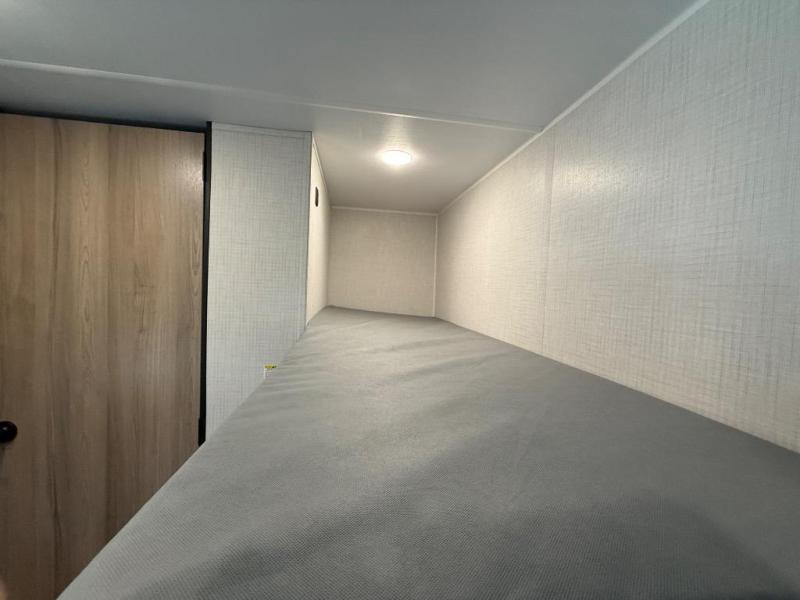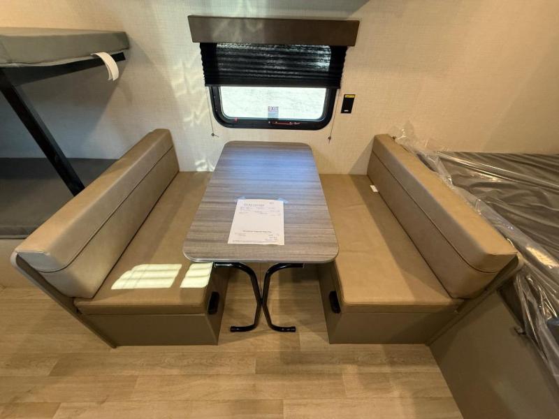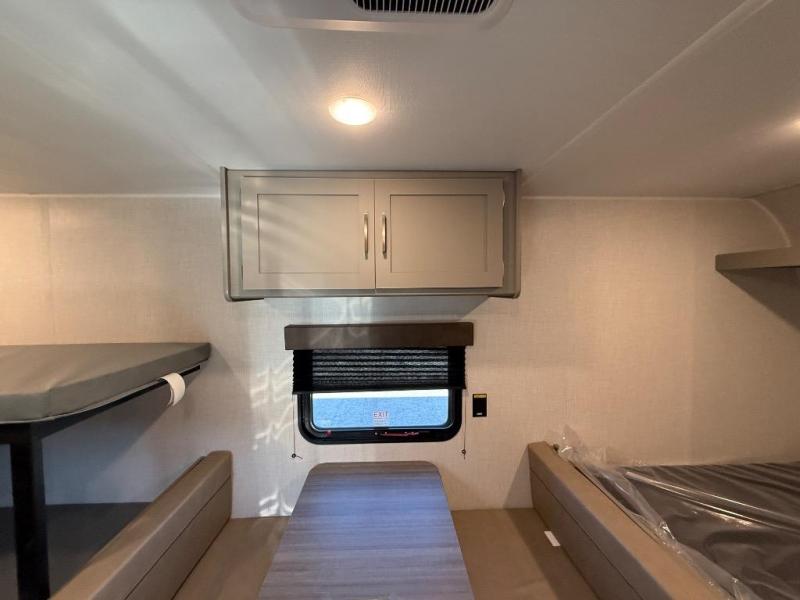 This trailer will fit perfectly for a group of five or less thanks to all the sleeping space! The owners will have a queen-size bed, and others can choose between the rear corner bunk beds or the booth dinette once set up for bedtime. There is a full bathroom for convenience when changing and getting cleaned up, a galley kitchen with a two burner cooktop plus a 3.3 cu. ft. refrigerator for the cold items. And you can stow your larger camping items in the exterior pass-through compartment.