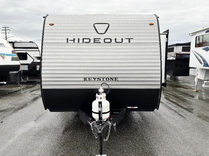 With any Hideout Mini travel trailer by Keystone, you will enjoy lightweight towing thanks to their single-axle! The AlphaPly TPO roof membrane is ultra durable, and the power awning will provide protection from the sun as you relax in your camp chairs outside. Each model includes blackout night shades, LED lighting, plus many more interior comforts. There is also a roof A/C and 20K BTU furnace to keep you comfortable, plus a tankless water heater for endless hot showers!