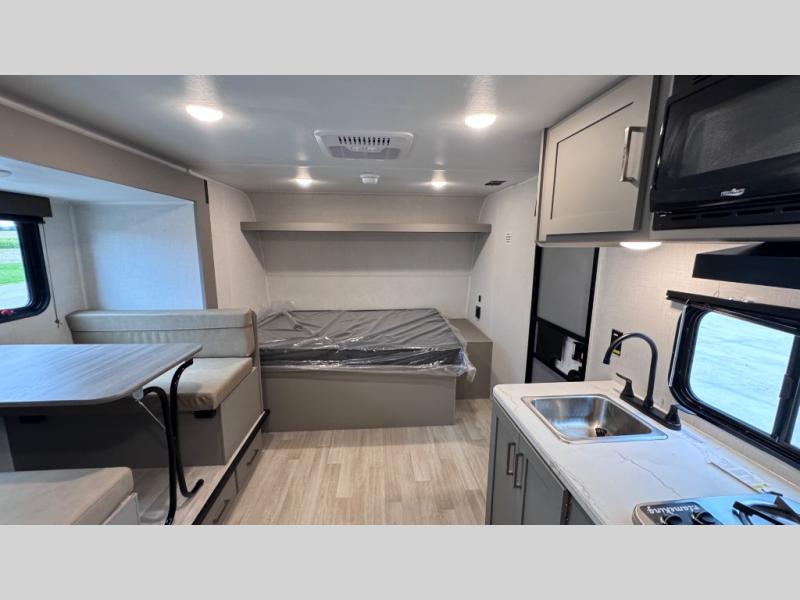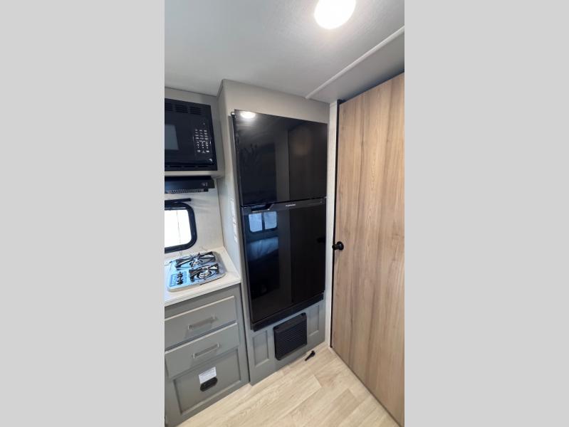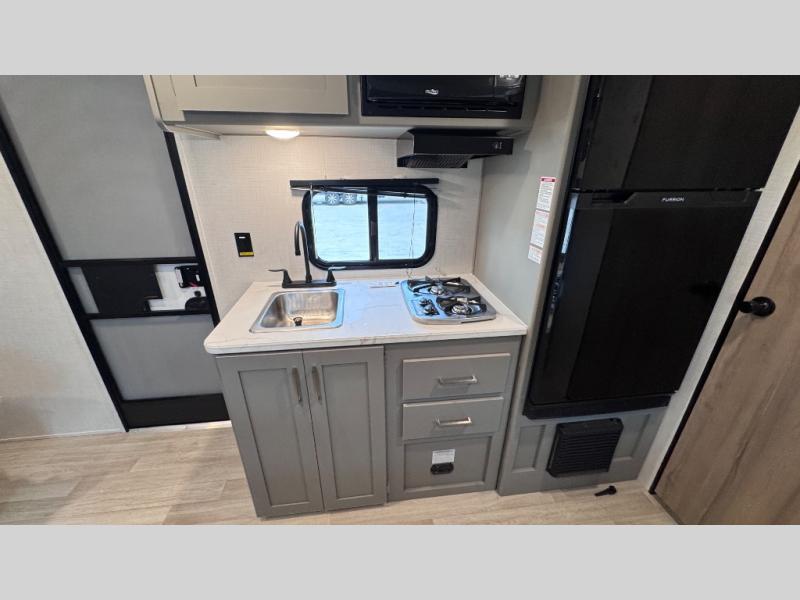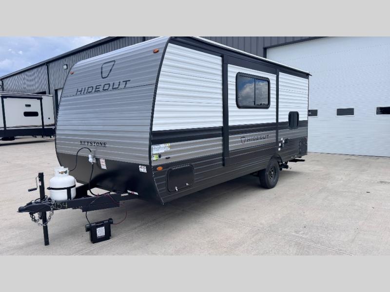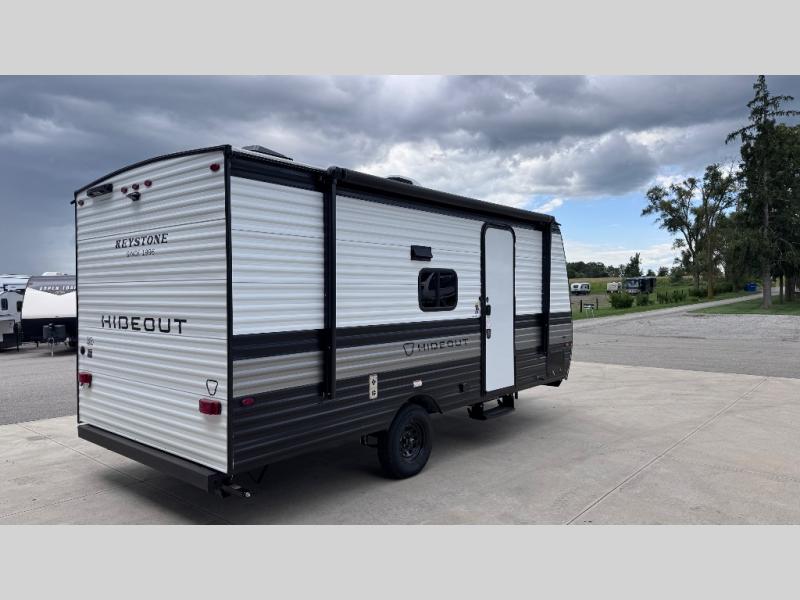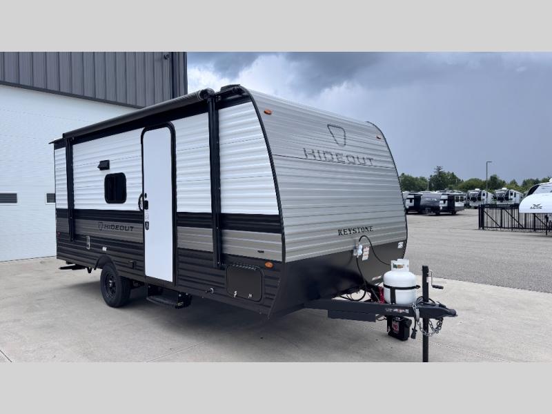 With any Hideout Mini travel trailer by Keystone, you will enjoy lightweight towing thanks to their single-axle! The AlphaPly TPO roof membrane is ultra durable, and the power awning will provide protection from the sun as you relax in your camp chairs outside. Each model includes blackout night shades, LED lighting, plus many more interior comforts. There is also a roof A/C and 20K BTU furnace to keep you comfortable, plus a tankless water heater for endless hot showers!