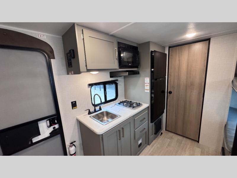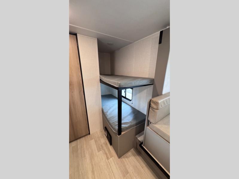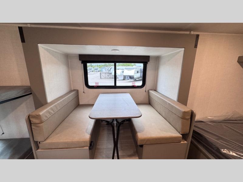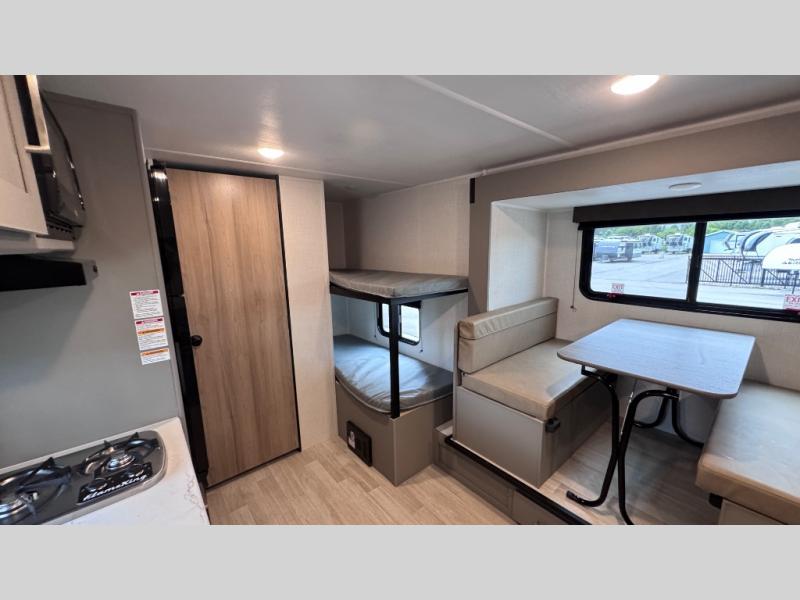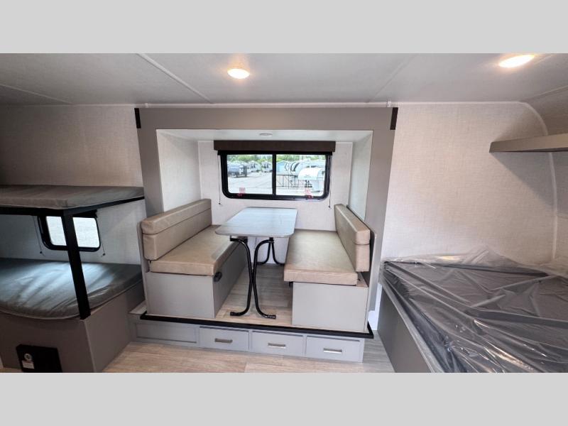 Step Inside this trailer where you can dine and relax on the slide out booth dinette which offers storage drawers below for your things. Everyone can take turns getting cleaned up in the full bathroom before falling asleep on the bunks, the queen-size bed or the booth dinette. The chef of your group will have a two burner cooktop to prepare meals and a 7.7 cu. ft. refrigerator for food storage. And the 10' power awning offers an outdoor living area protected from the elements once you add your camping chairs taken from the pass-through compartment.