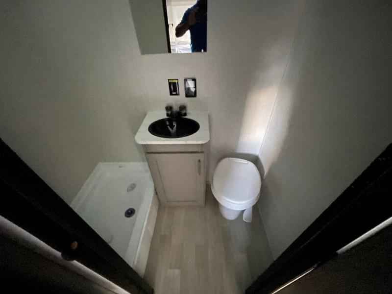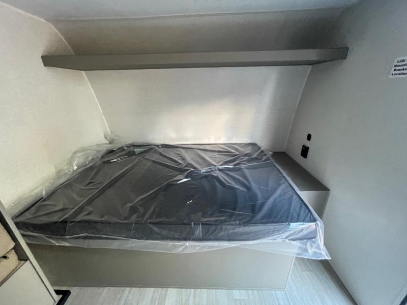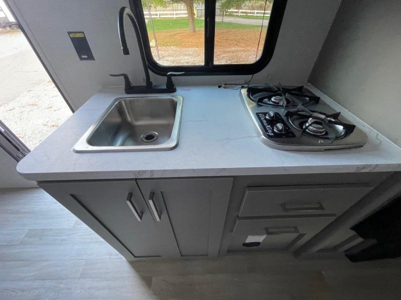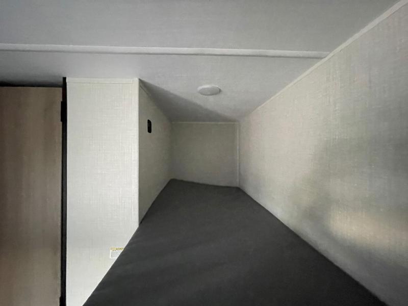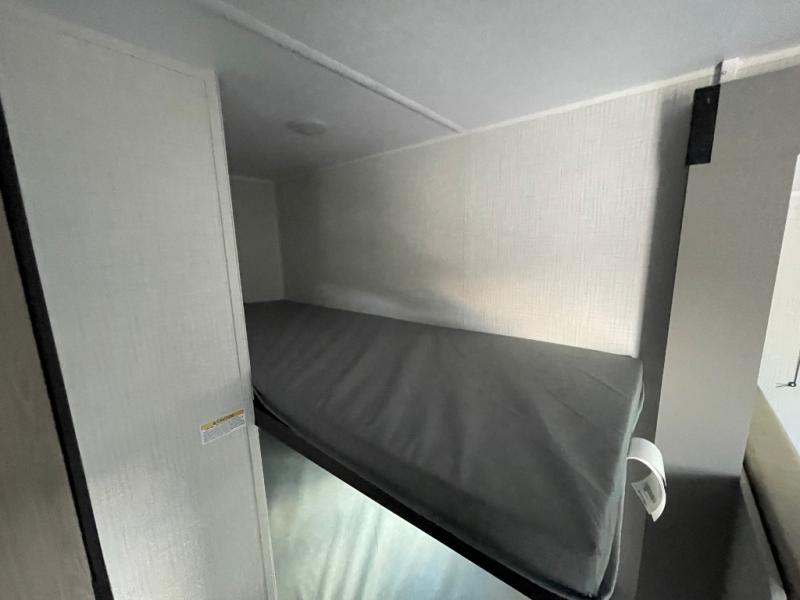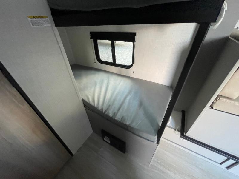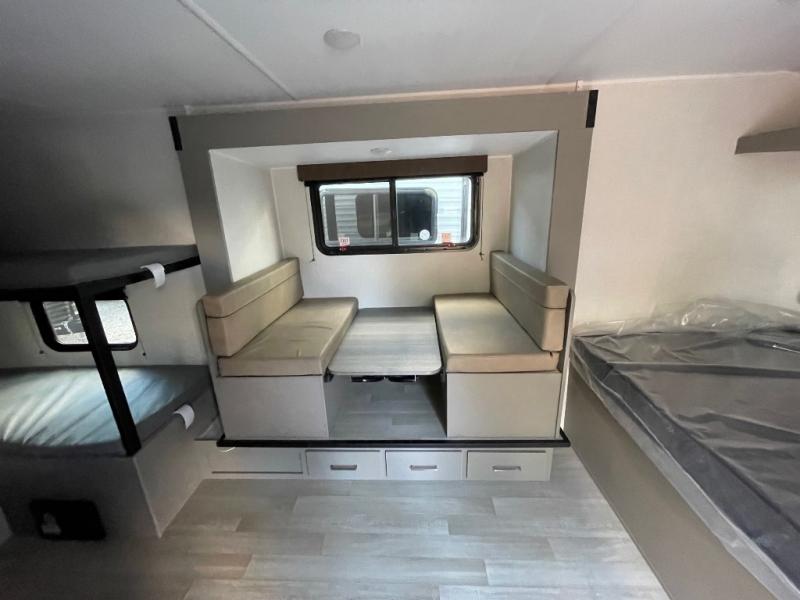 Step Inside this trailer where you can dine and relax on the slide out booth dinette which offers storage drawers below for your things. Everyone can take turns getting cleaned up in the full bathroom before falling asleep on the bunks, the queen-size bed or the booth dinette. The chef of your group will have a two burner cooktop to prepare meals and a 7.7 cu. ft. refrigerator for food storage. And the 10' power awning offers an outdoor living area protected from the elements once you add your camping chairs taken from the pass-through compartment.