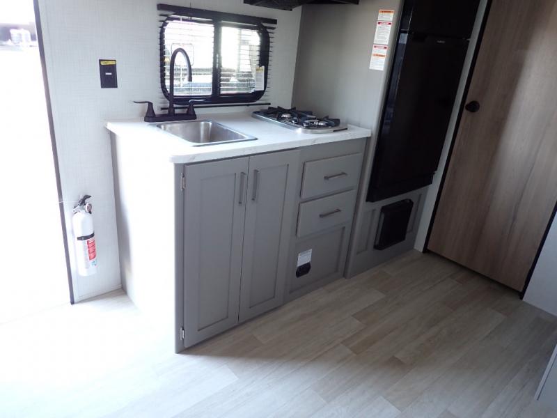 With any Hideout Mini travel trailer by Keystone, you will enjoy lightweight towing thanks to their single-axle! The AlphaPly TPO roof membrane is ultra durable, and the power awning will provide protection from the sun as you relax in your camp chairs outside. Each model includes blackout night shades, LED lighting, plus many more interior comforts. There is also a roof A/C and 20K BTU furnace to keep you comfortable, plus a tankless water heater for endless hot showers!