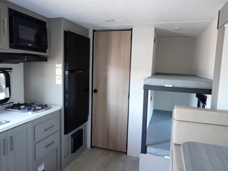 Step Inside this trailer where you can dine and relax on the slide out booth dinette which offers storage drawers below for your things. Everyone can take turns getting cleaned up in the full bathroom before falling asleep on the bunks, the queen-size bed or the booth dinette. The chef of your group will have a two burner cooktop to prepare meals and a 7.7 cu. ft. refrigerator for food storage. And the 10' power awning offers an outdoor living area protected from the elements once you add your camping chairs taken from the pass-through compartment.