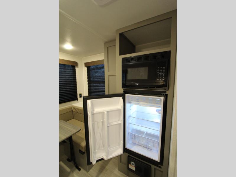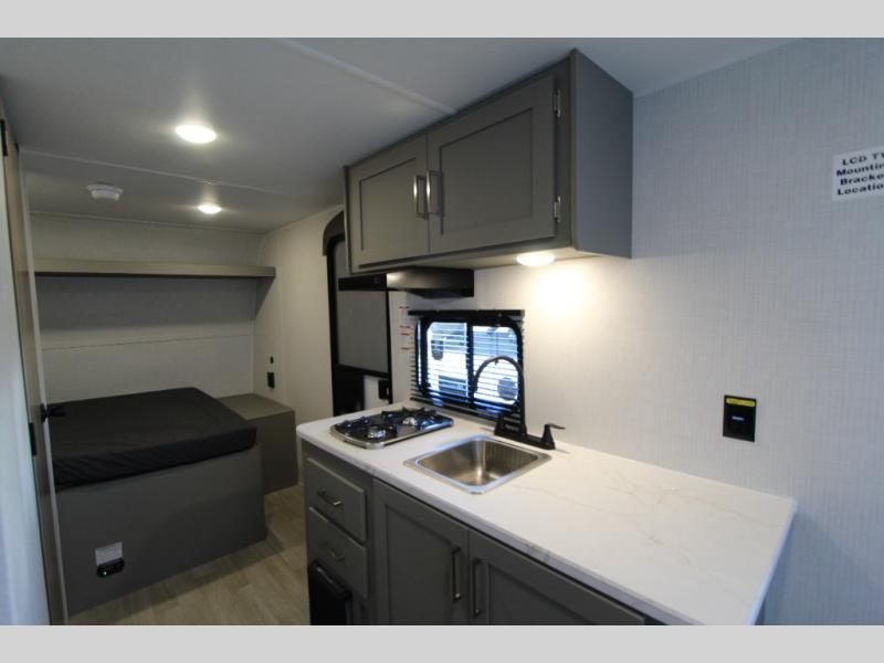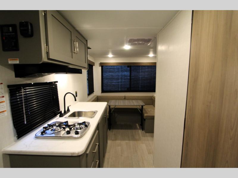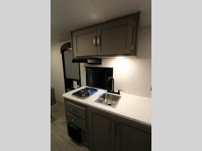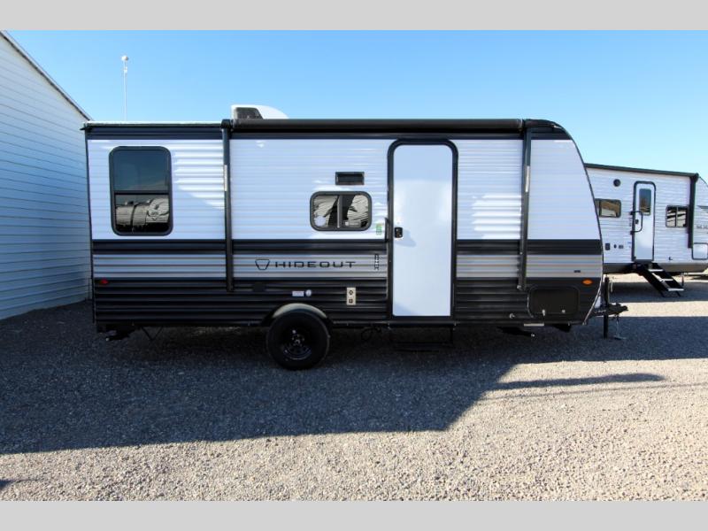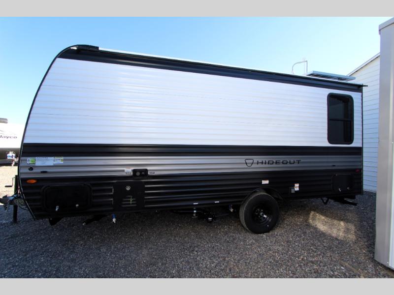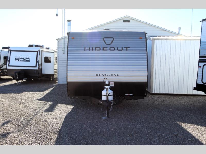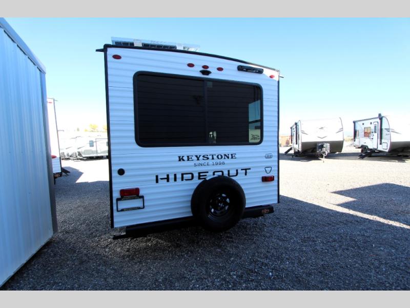With any Hideout Mini travel trailer by Keystone, you will enjoy lightweight towing thanks to their single-axle! The AlphaPly TPO roof membrane is ultra durable, and the power awning will provide protection from the sun as you relax in your camp chairs outside. Each model includes blackout night shades, LED lighting, plus many more interior comforts. There is also a roof A/C and 20K BTU furnace to keep you comfortable, plus a tankless water heater for endless hot showers!