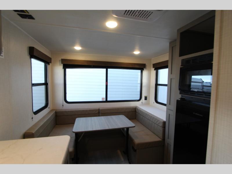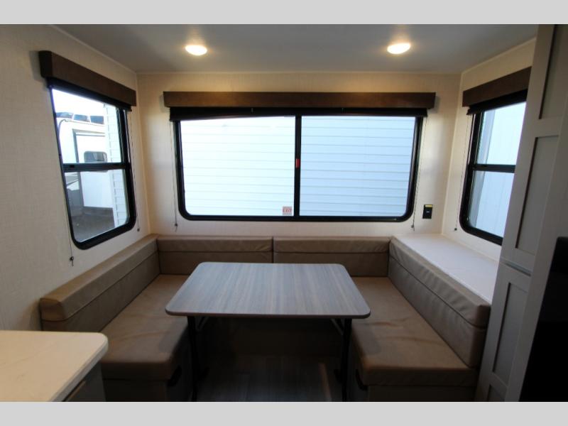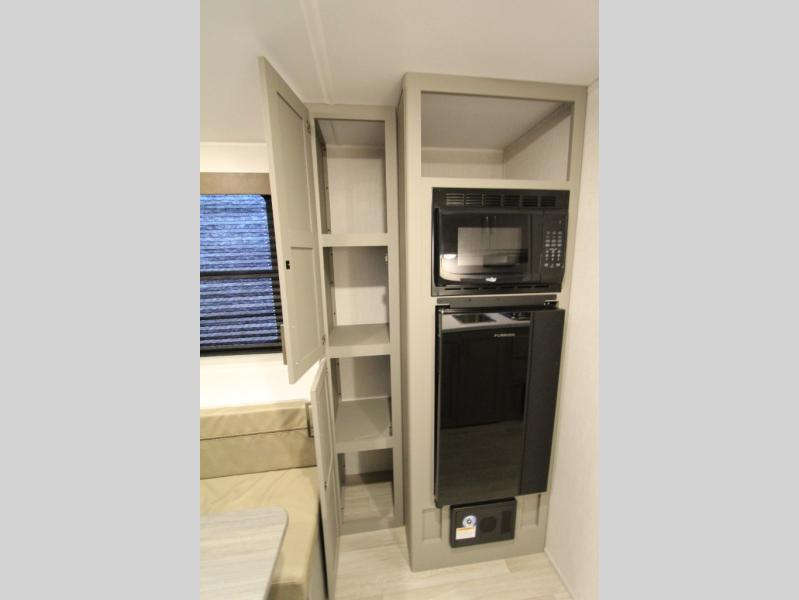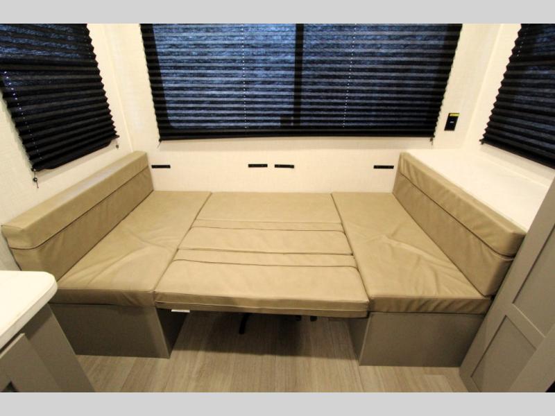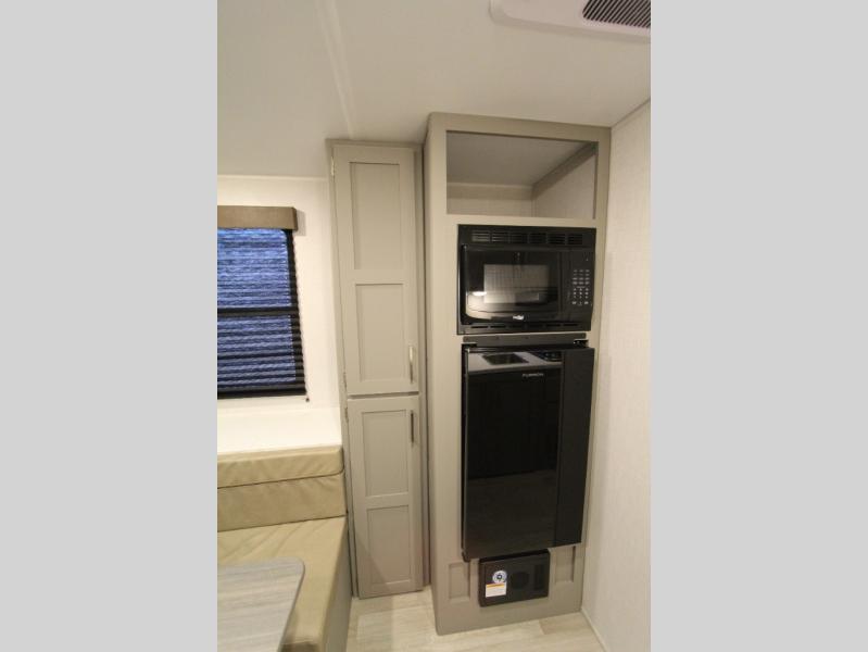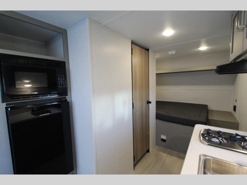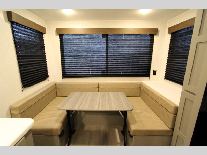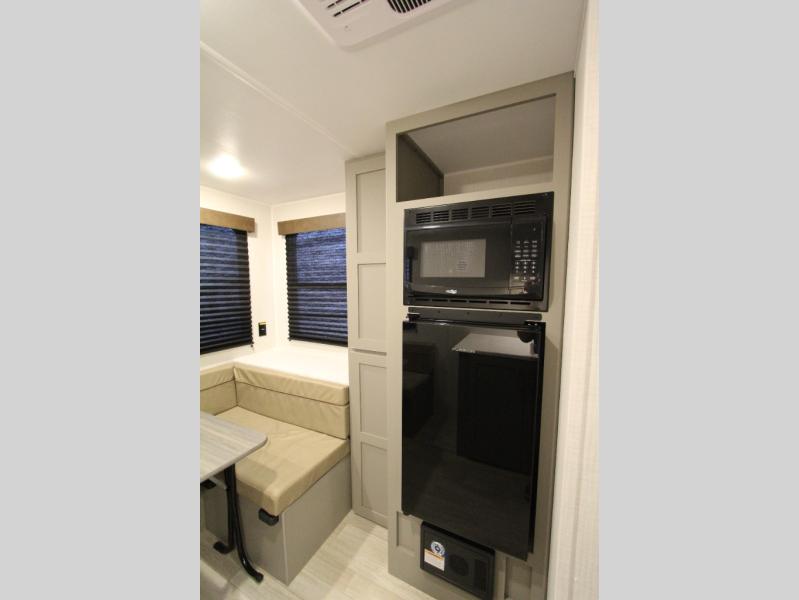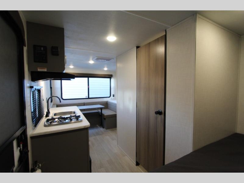 With any Hideout Mini travel trailer by Keystone, you will enjoy lightweight towing thanks to their single-axle! The AlphaPly TPO roof membrane is ultra durable, and the power awning will provide protection from the sun as you relax in your camp chairs outside. Each model includes blackout night shades, LED lighting, plus many more interior comforts. There is also a roof A/C and 20K BTU furnace to keep you comfortable, plus a tankless water heater for endless hot showers!