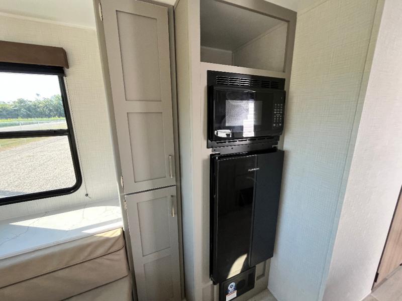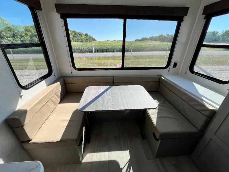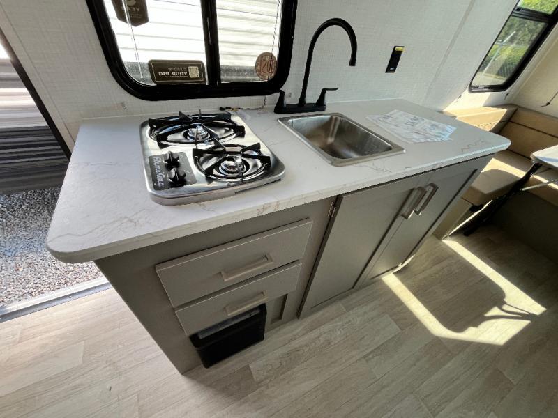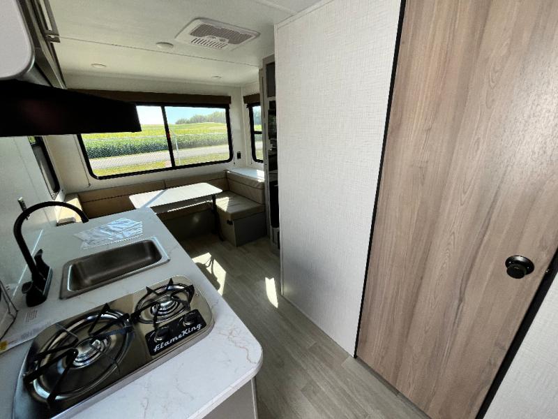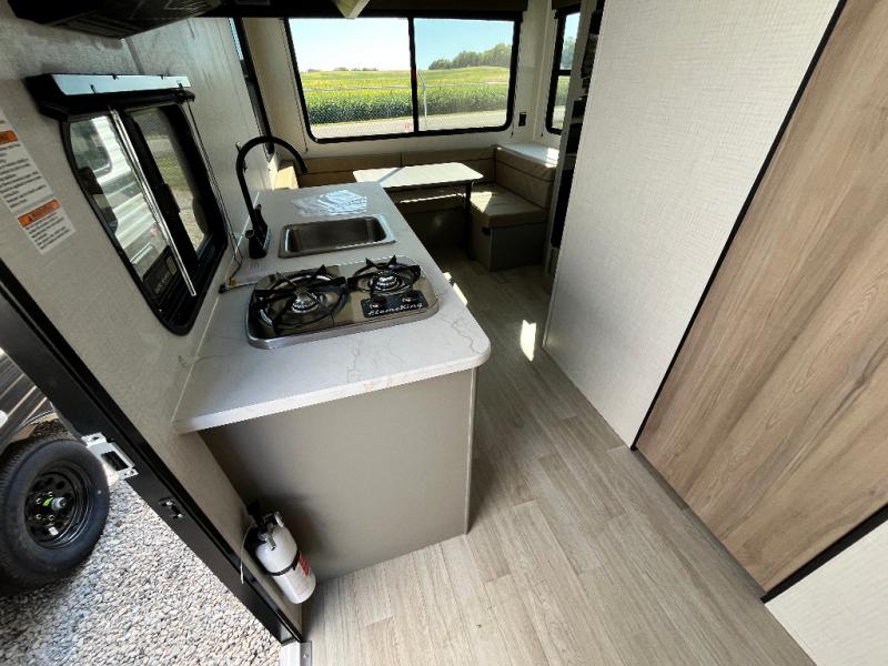 With any Hideout Mini travel trailer by Keystone, you will enjoy lightweight towing thanks to their single-axle! The AlphaPly TPO roof membrane is ultra durable, and the power awning will provide protection from the sun as you relax in your camp chairs outside. Each model includes blackout night shades, LED lighting, plus many more interior comforts. There is also a roof A/C and 20K BTU furnace to keep you comfortable, plus a tankless water heater for endless hot showers!